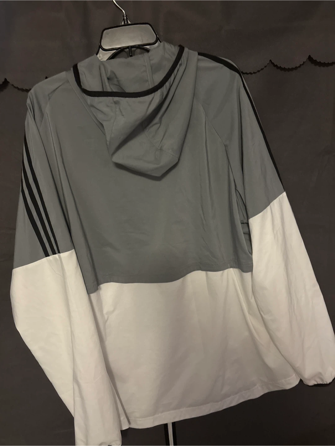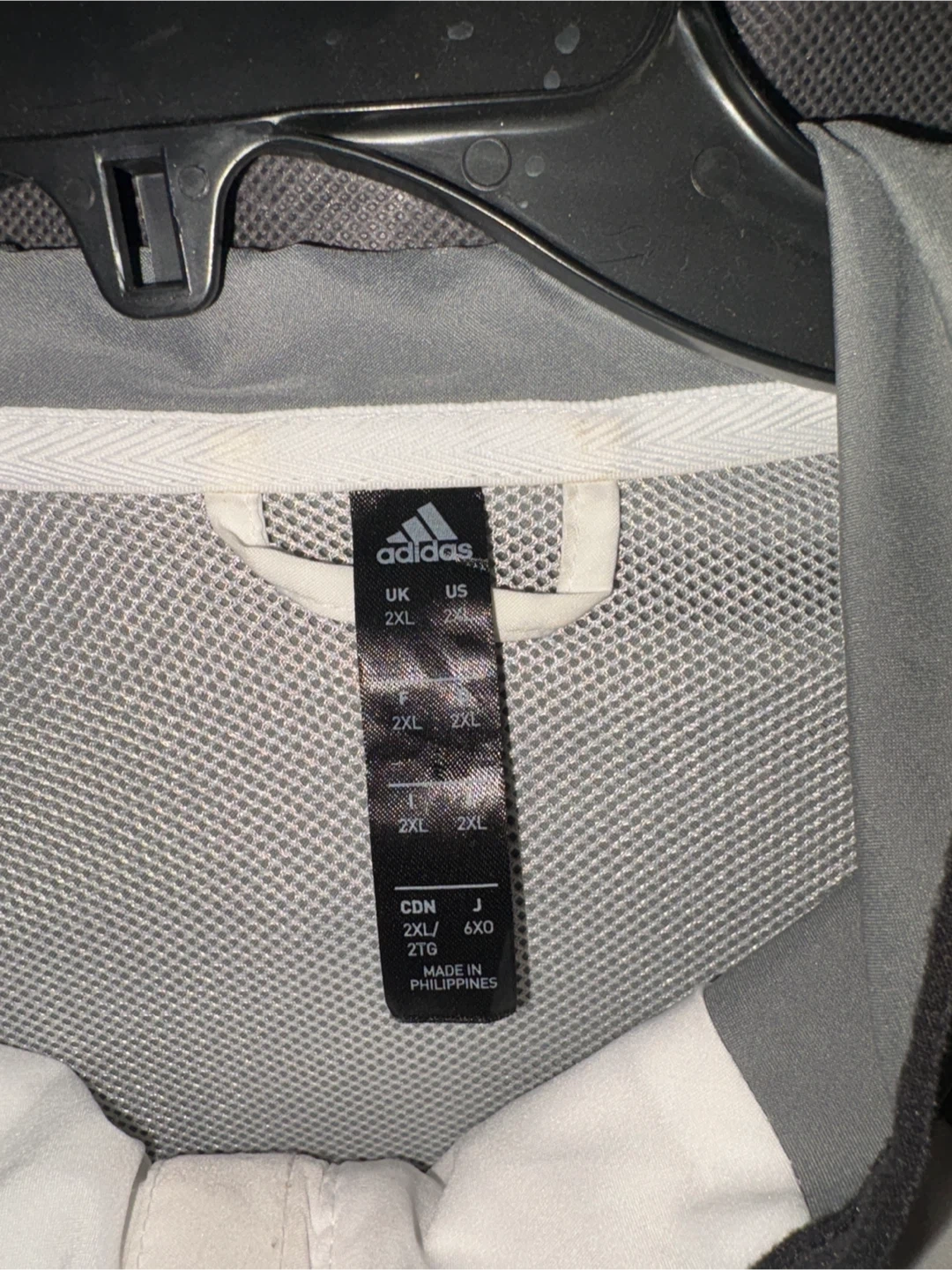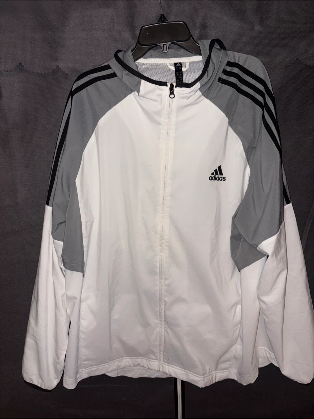Selling an Adidas windbreaker jacket in size 2XL. It's white and grey with the classic three stripes on the sleeves. Great for outdoor activities!