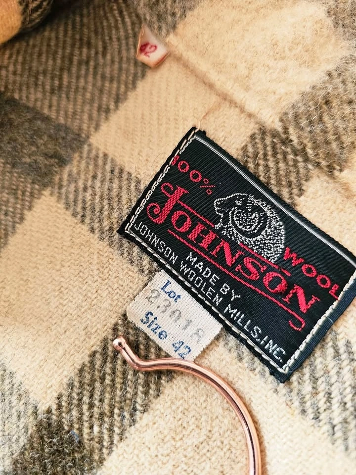 Jacket is made by Johnson Woollen Mills. It is in spectacular vintage condition and still looks like new. It has 2 patch pockets with button flaps at the chest, 2 side pockets, and brown tortoiseshell style buttons down the front and at the sleeve cuffs. Jacket is unlined.