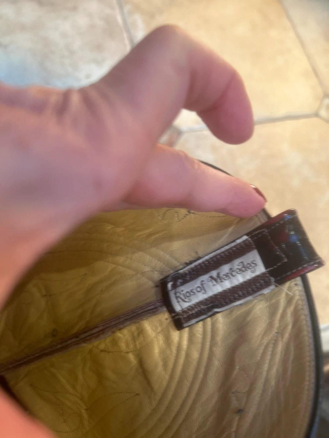 Selling a pair of genuine leather embossed black cherry color leather cowboy boots. They have a really cool design with red accents. They're in good condition and ready for a new owner!
