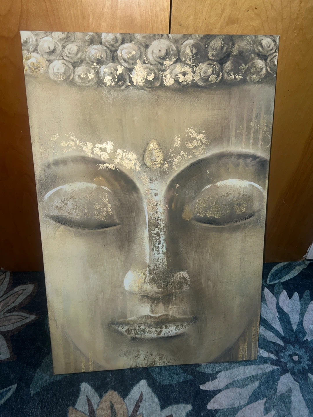Here is a Buddha canvas wall art piece. It's in great condition and ready to add a touch of serenity to your space. The picture shows the size reference, taken against my apartment door. Condition: Hung For One Year in a spare room for decor