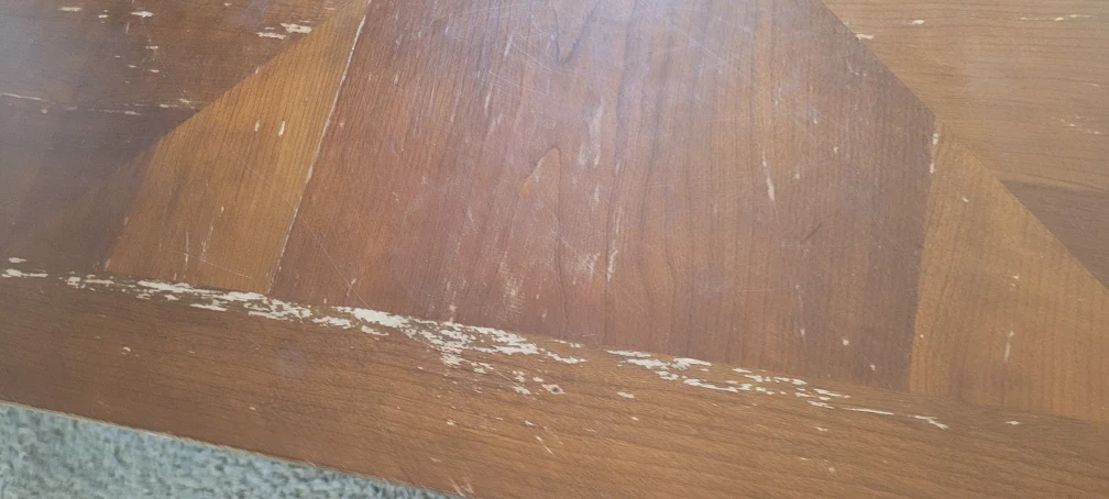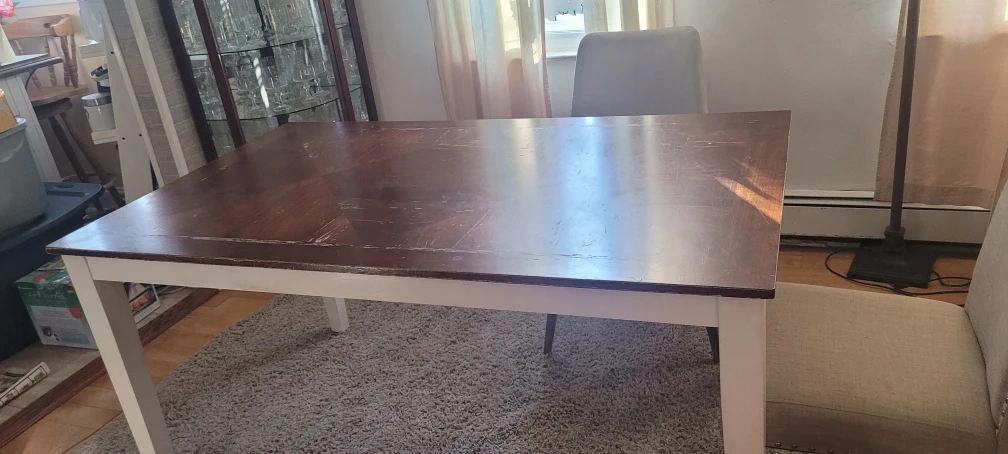 Selling a dining table with chairs. The table has a wooden top and white legs. The chairs are upholstered in a light gray fabric with a quilted pattern on the back. There are some signs of wear on the table top.