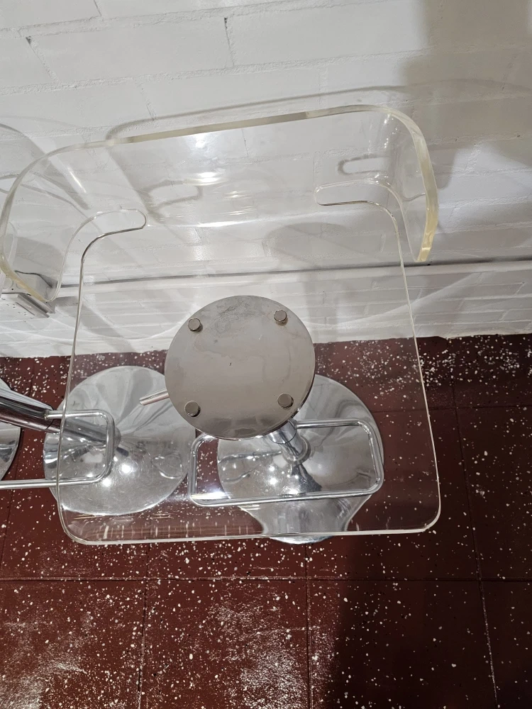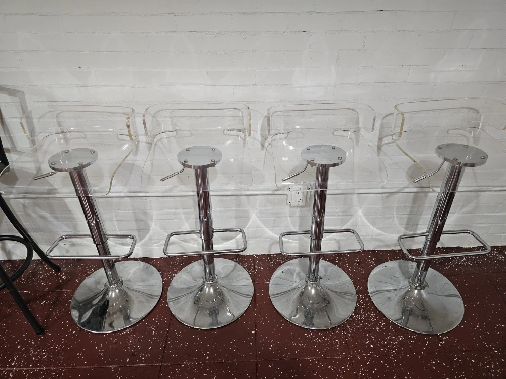 Selling a set of 4 bar stools with clear acrylic seats and chrome bases. They have a modern look and would be great for a kitchen island or bar area. They're in good condition!