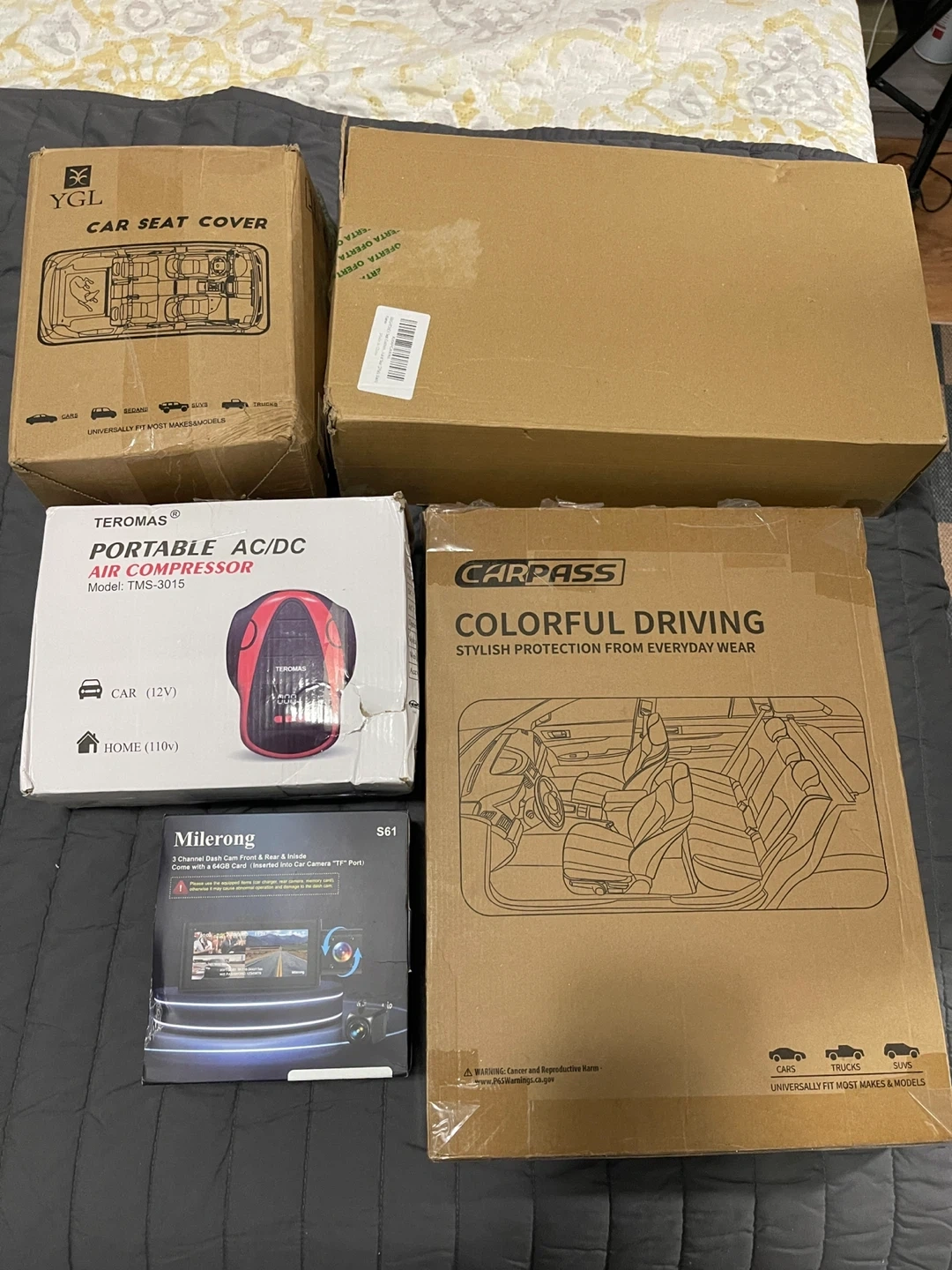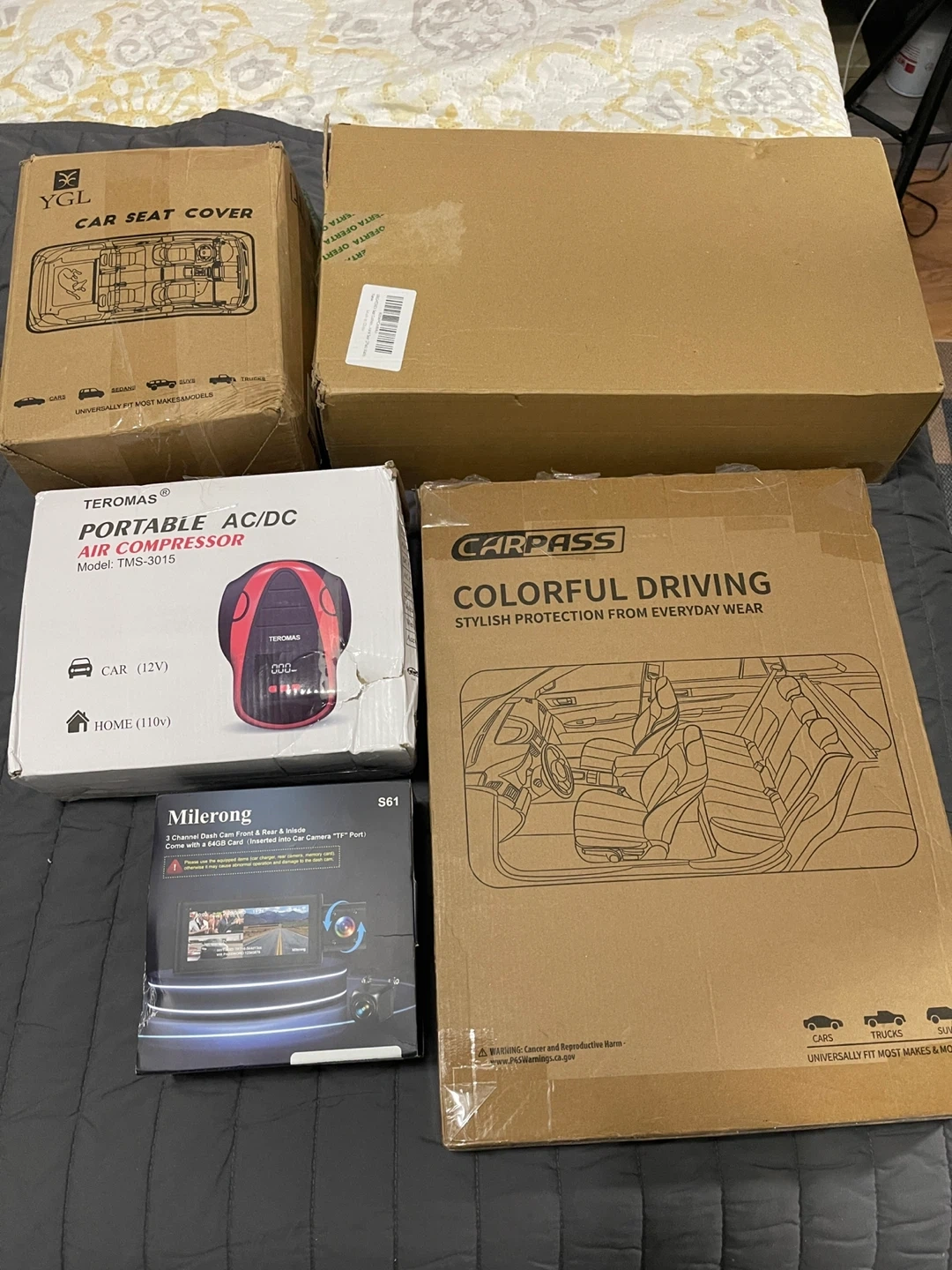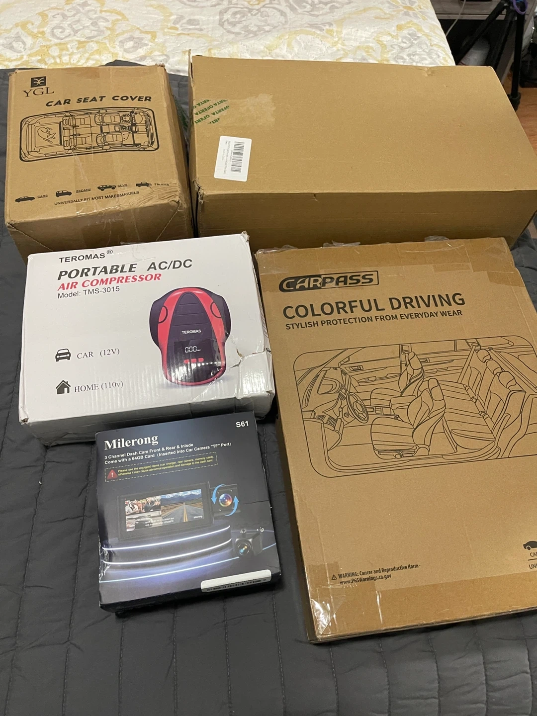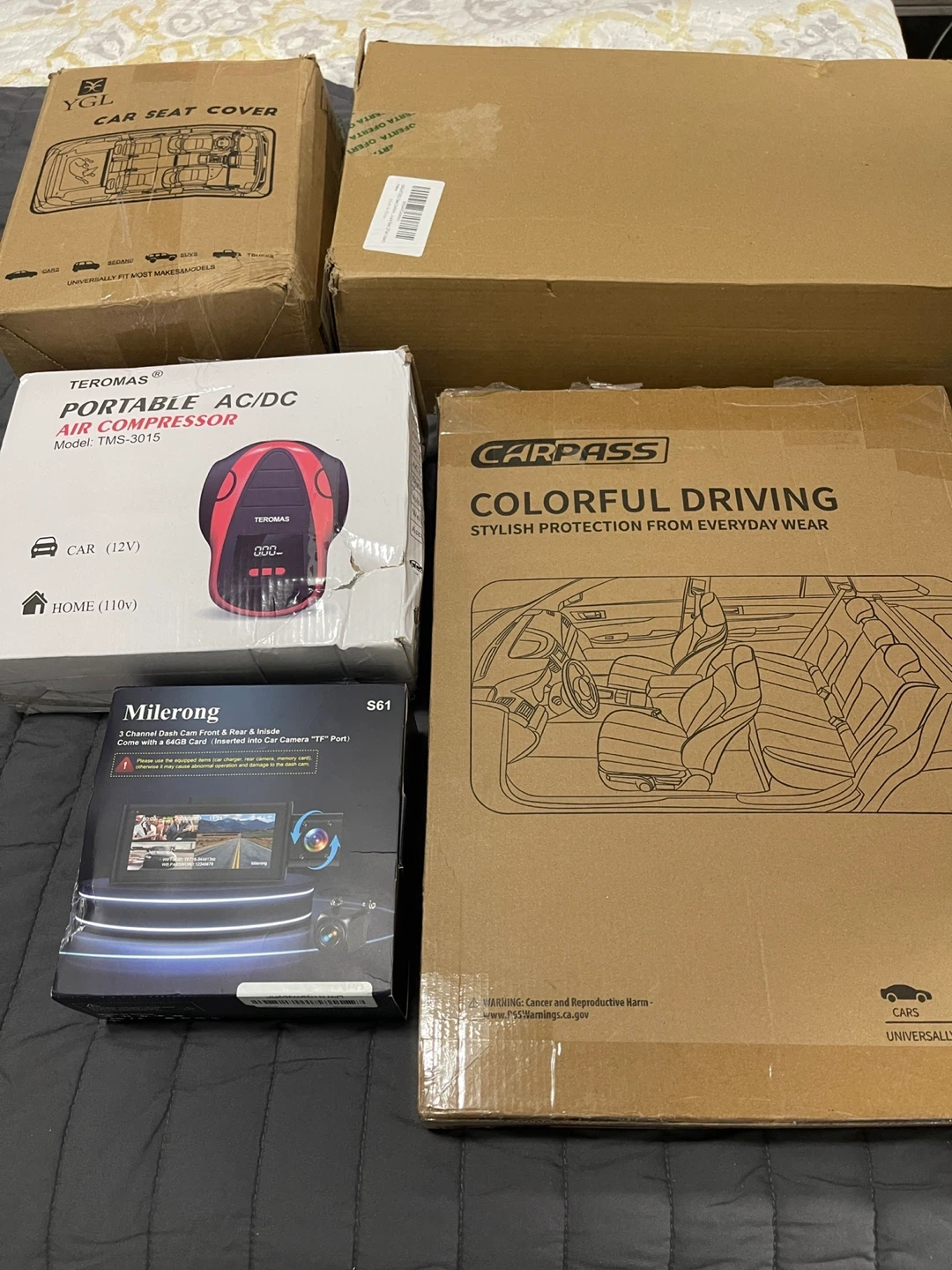 Selling a bundle of car accessories, all in their original boxes! This includes a CarPass Colorful Driving seat cover, a YGL car seat cover, a Milerong S61 3 Channel Dash Cam, and a Teromas Portable AC/DC Air Compressor Model TMS-3015