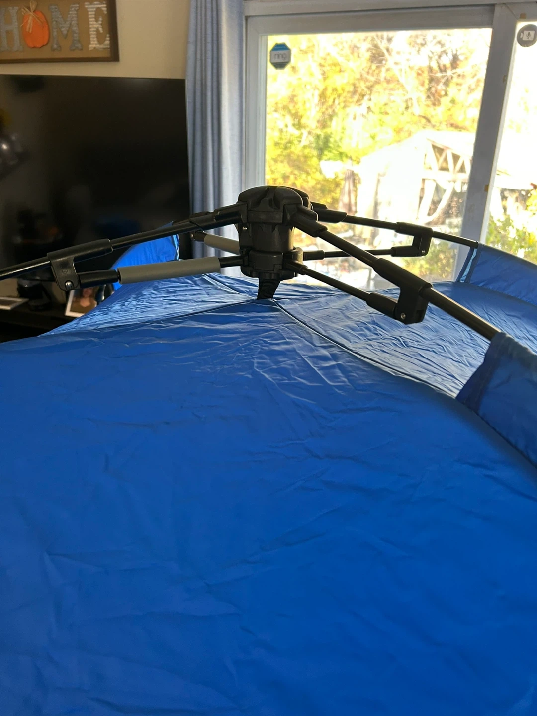 This is a Member's Mark Instant Sun Shelter. The actual color is blue. The product was originally bought for $49.98. It measures approximately 71 inches in length and 58 inches in height.