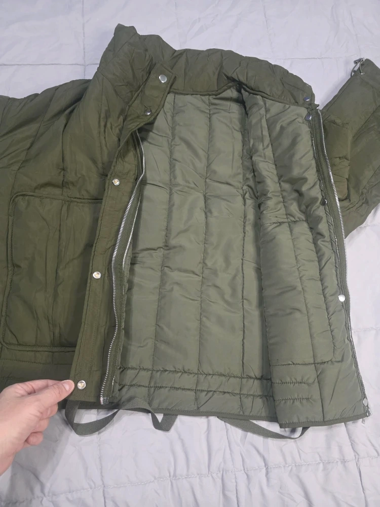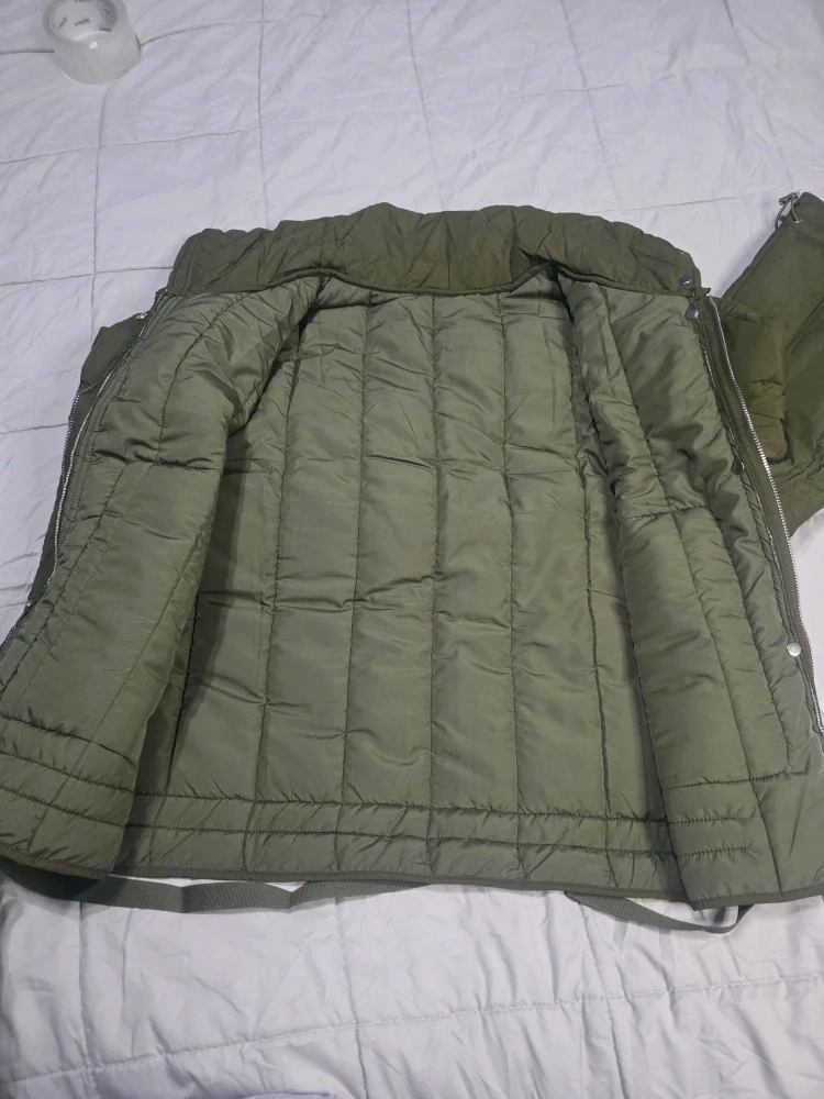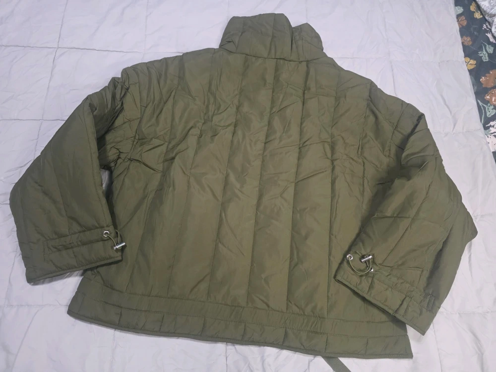 This is a gently used olive green padded jacket. SizeLarge new! It's a stylish and comfortable choice for cooler weather pleasecheckmyanotherlistingsthankyou.