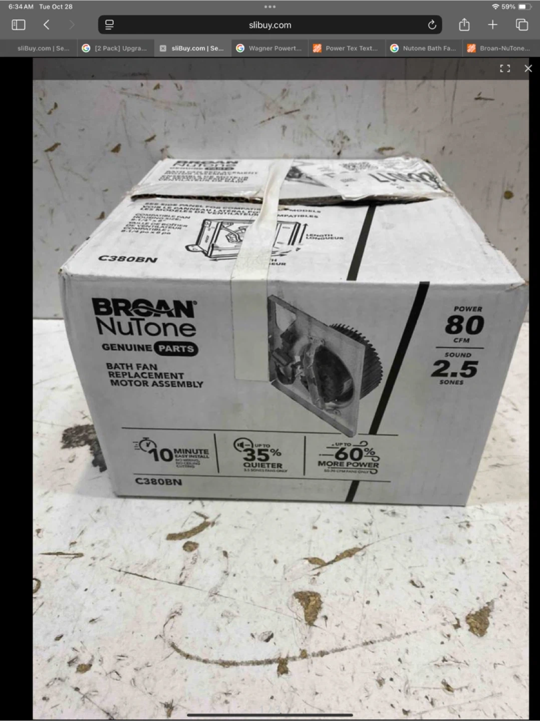 Selling a Broan NuTone bath fan replacement motor assembly. It's the C380BN model. This is a genuine parts replacement. It's designed for a 10-minute easy install and is up to 35% quieter and up to 60% more powerful. It has a power of 80 CFM and a sound of 2.5 sones.