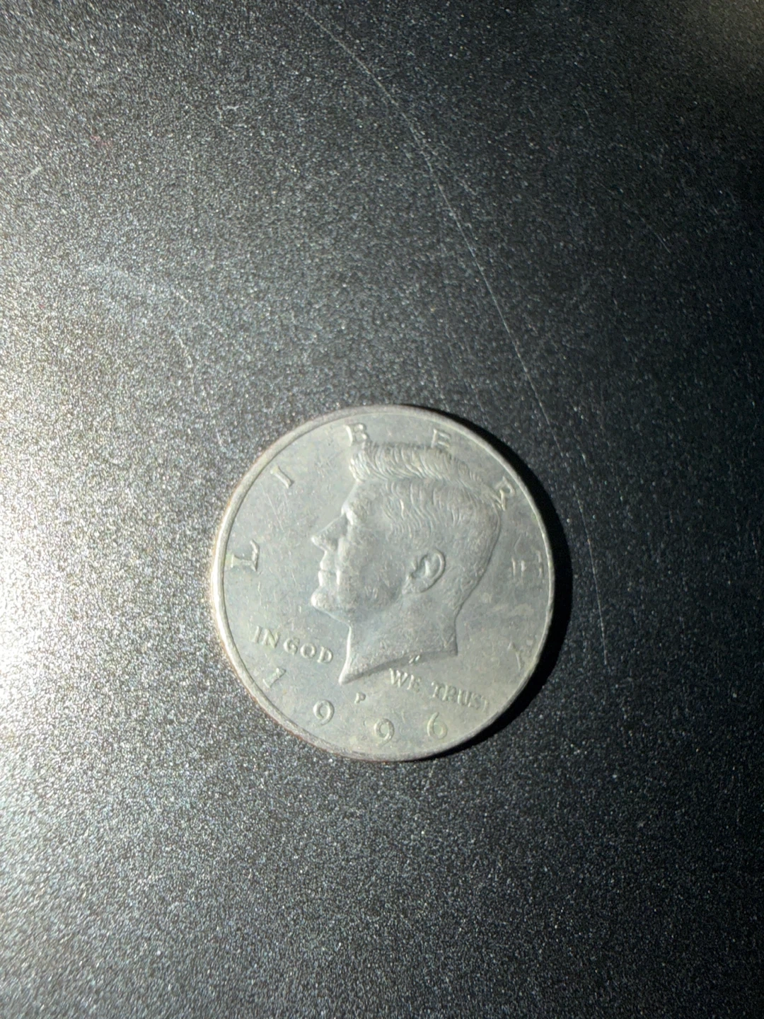 Selling a Kennedy Half Dollar coin! It has some wear, but it's still in decent shape. The coin features the iconic image of John F Kennedy and the words 'Half Dollar'
