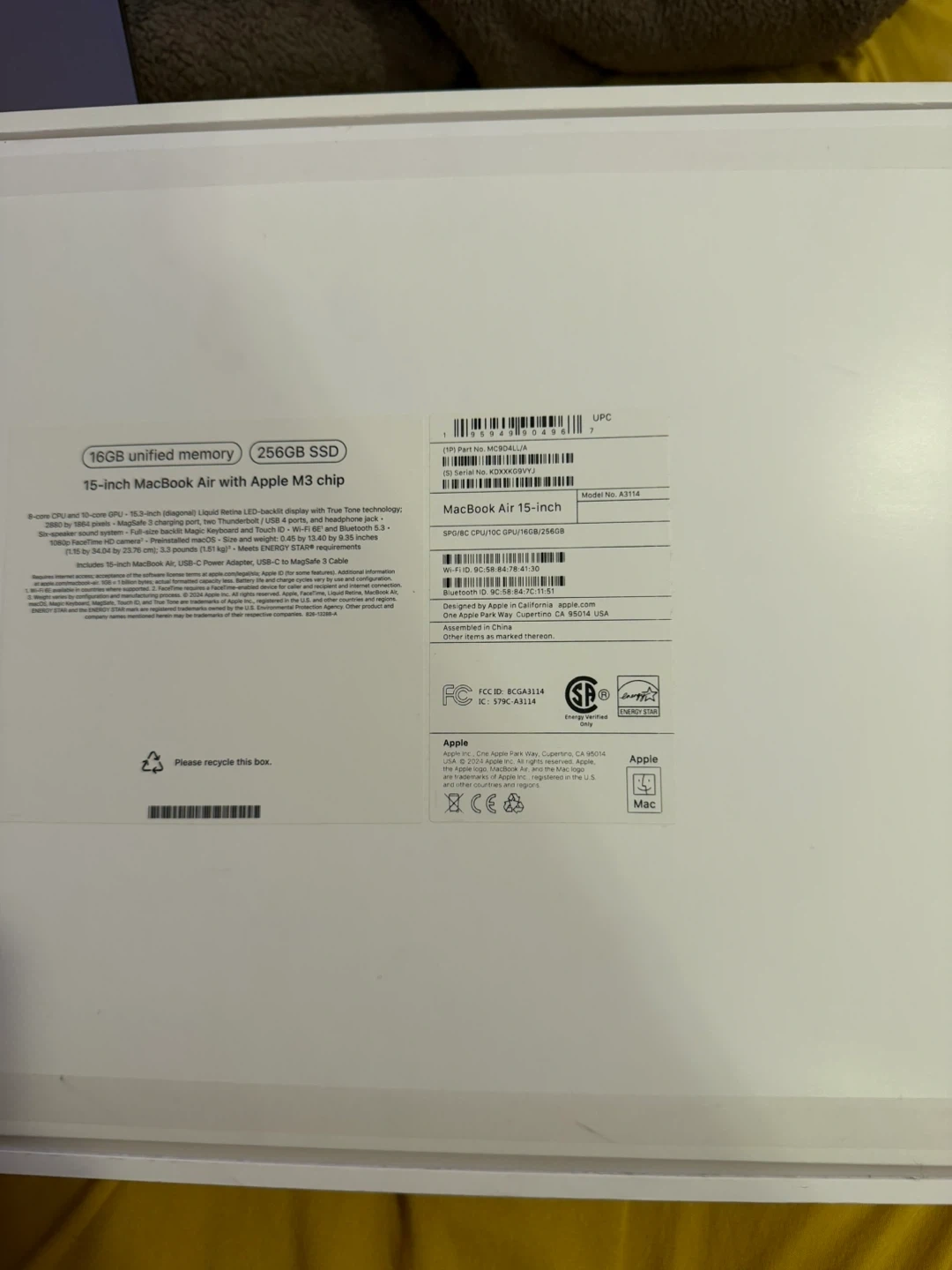 Selling my MacBook Air 15-inch with the M3 chip! It has 16GB of unified memory and a 256GB SSD. The box is included. It also comes with a charger. I literally used it 3 to 4 times