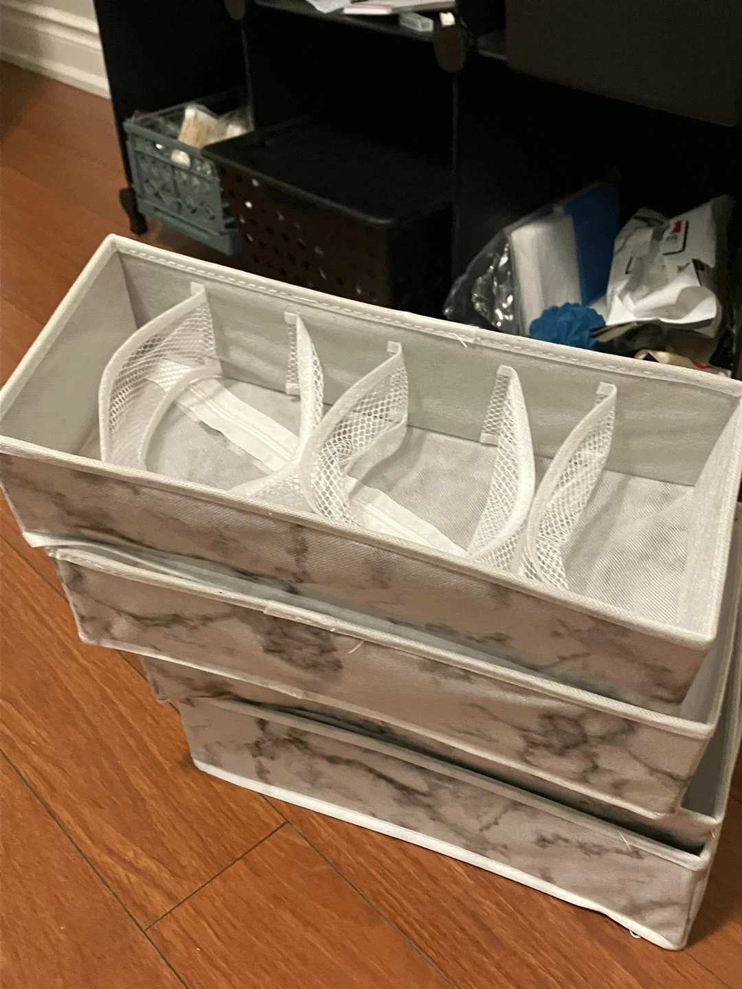 A set of four drawer organizers with a marble pattern.