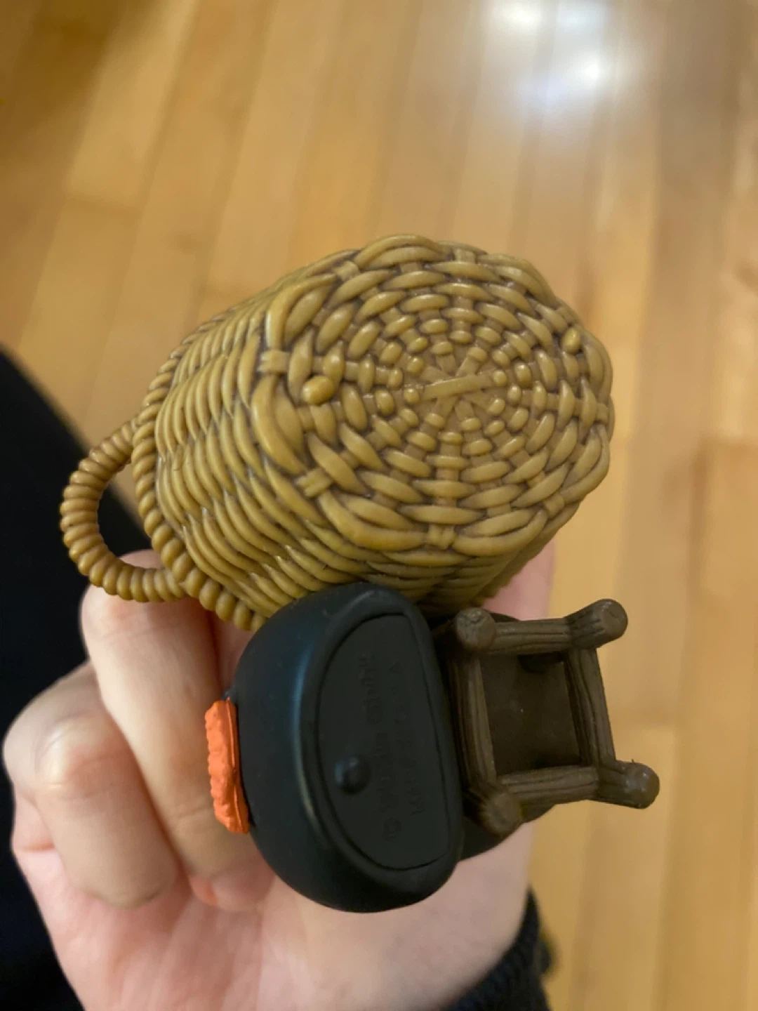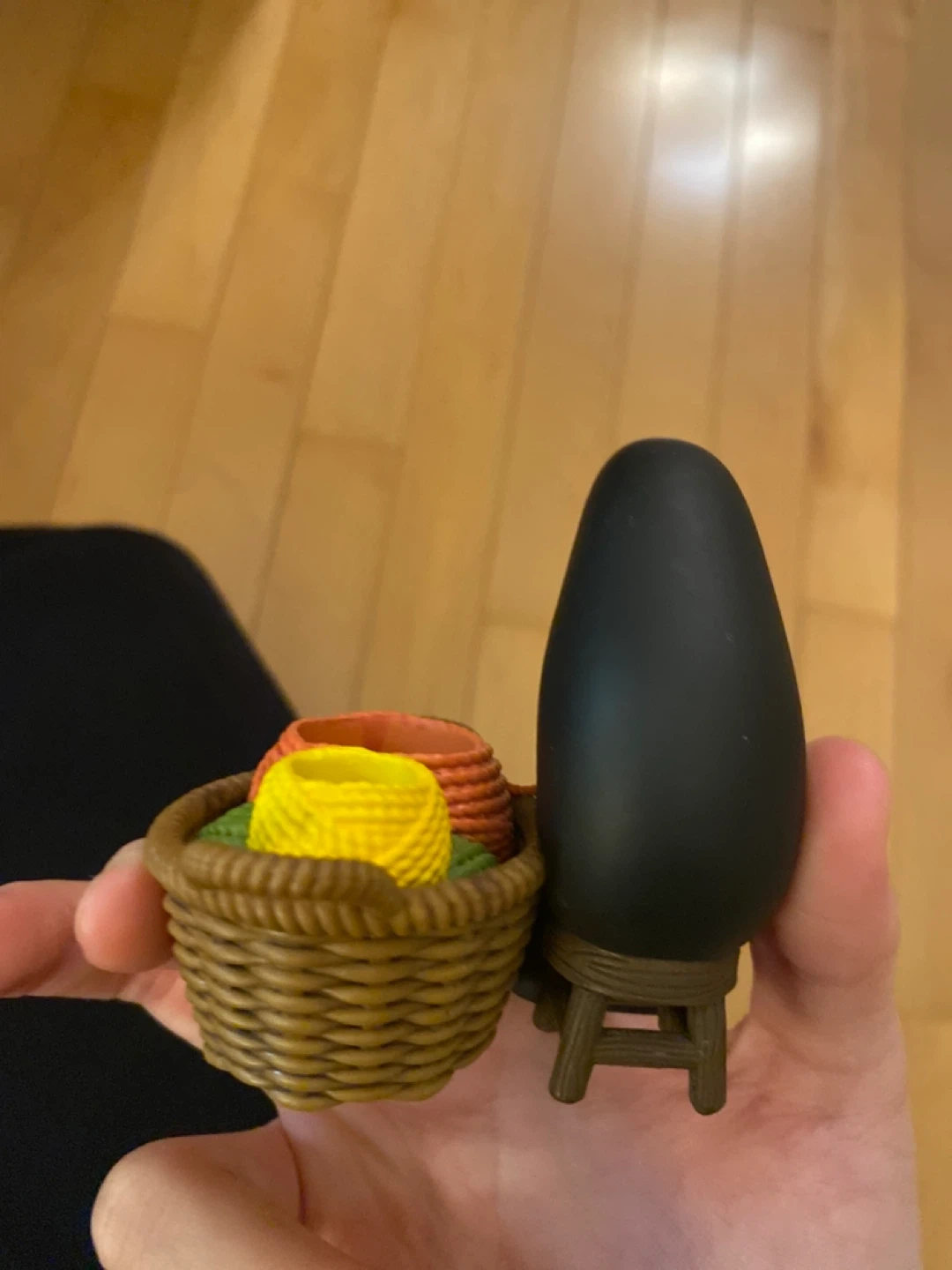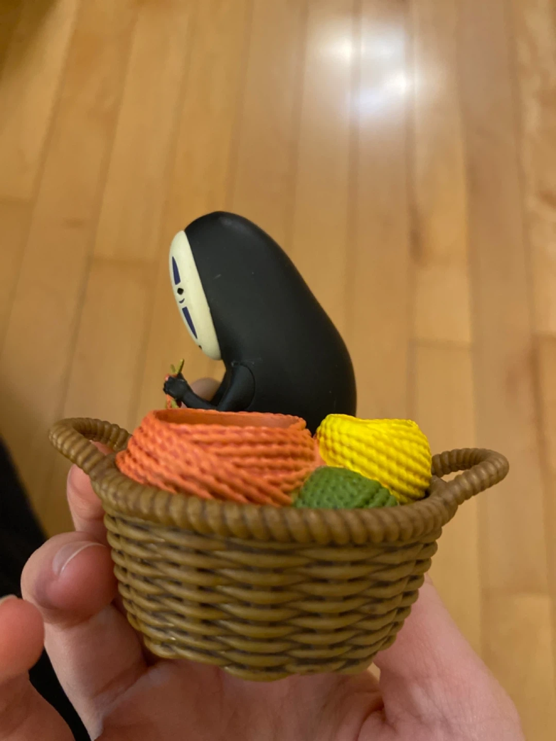 Here's a cute No-Face figure from Studio Ghibli's Spirited Away! He's sitting on a little stool and knitting, with a basket of yarn beside him. A charming addition for any Ghibli fan!
