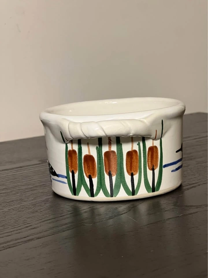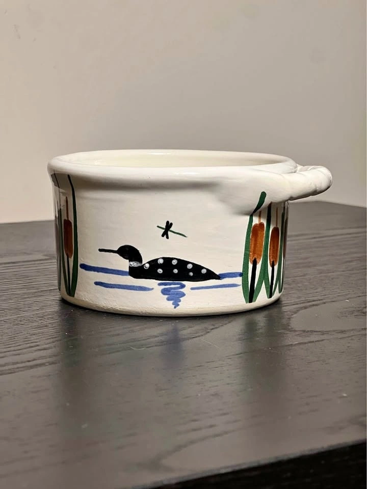 Design: The bowl features a hand-painted scene with a common loon swimming in blue water, surrounded by green cattails with brown tops, and a small black dragonfly in the air.