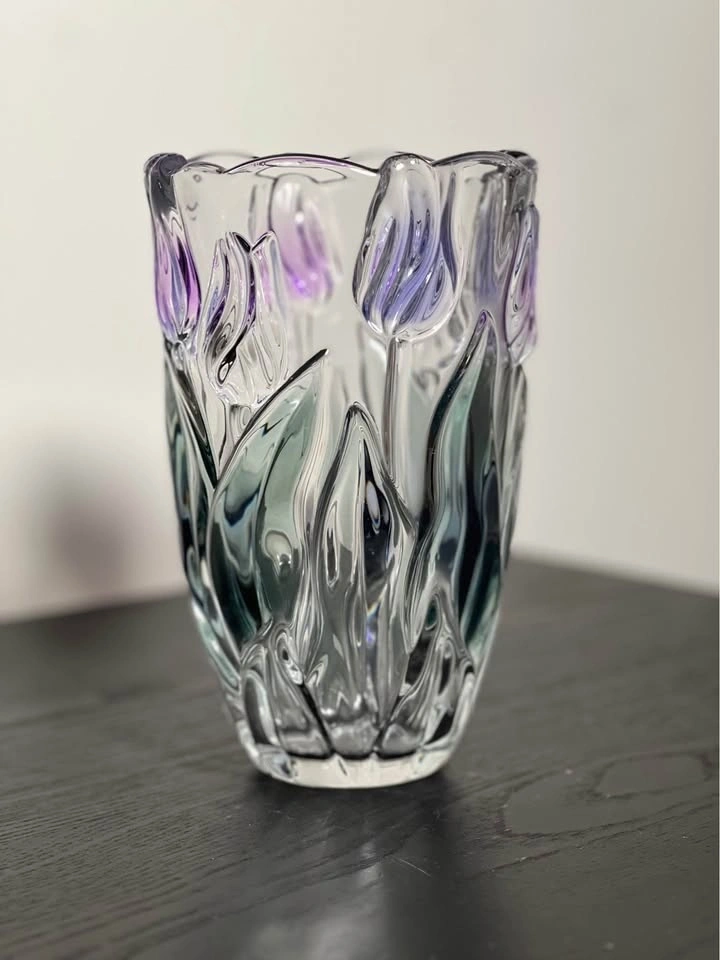 Design: Embossed (raised) tulips in clear glass with hints of purple and green coloring