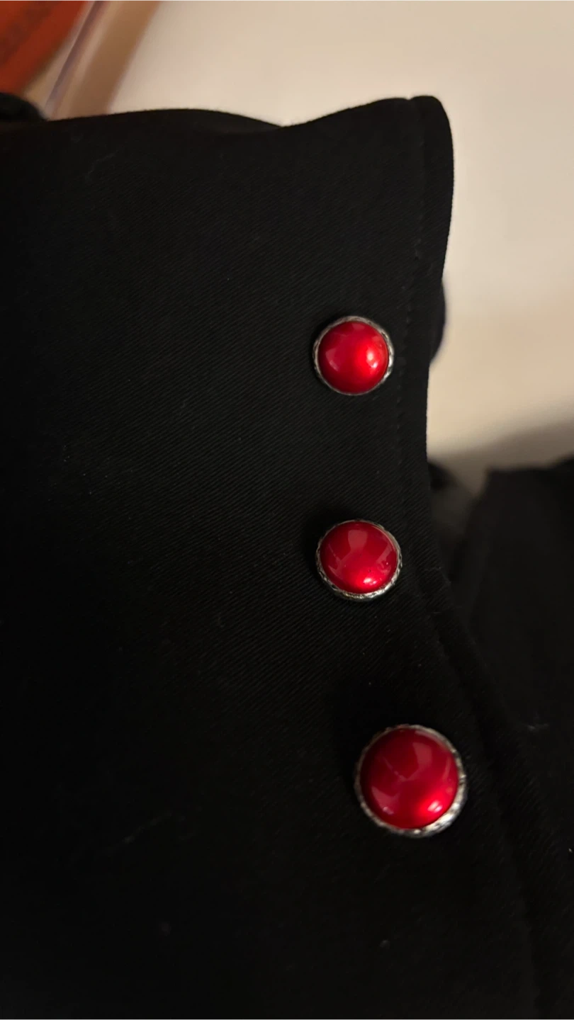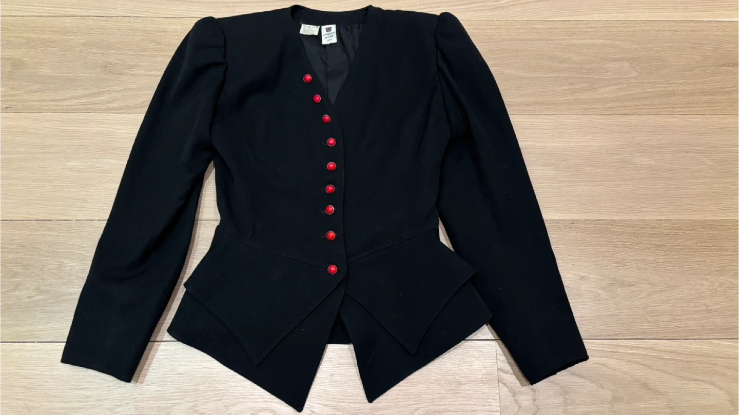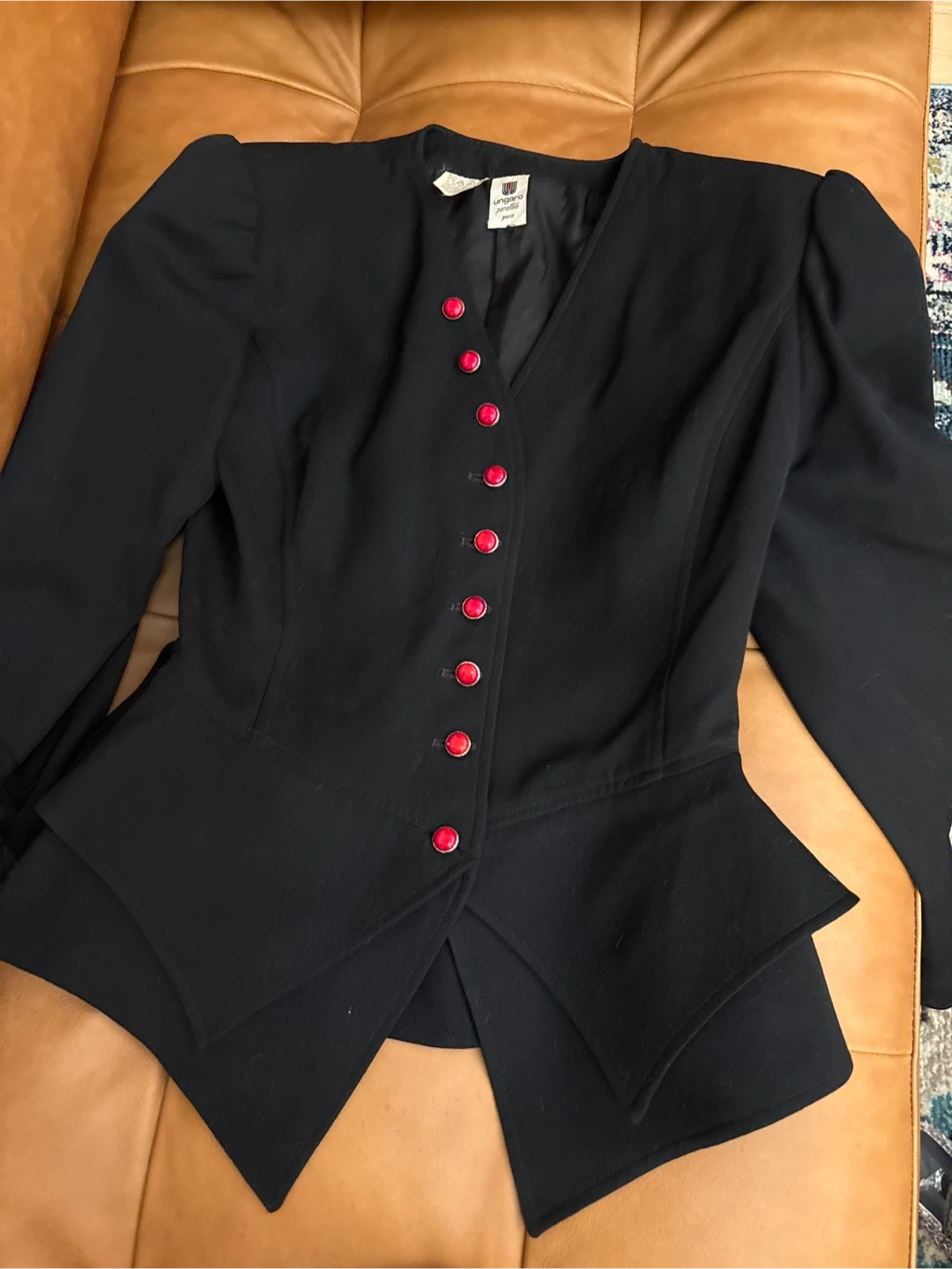 stylish vintage black jacket from Ungaro Parallèle Paris. It features unique red button accents and a distinctive design. Perfect for adding a touch of elegance to any outfit! Size 2 -4