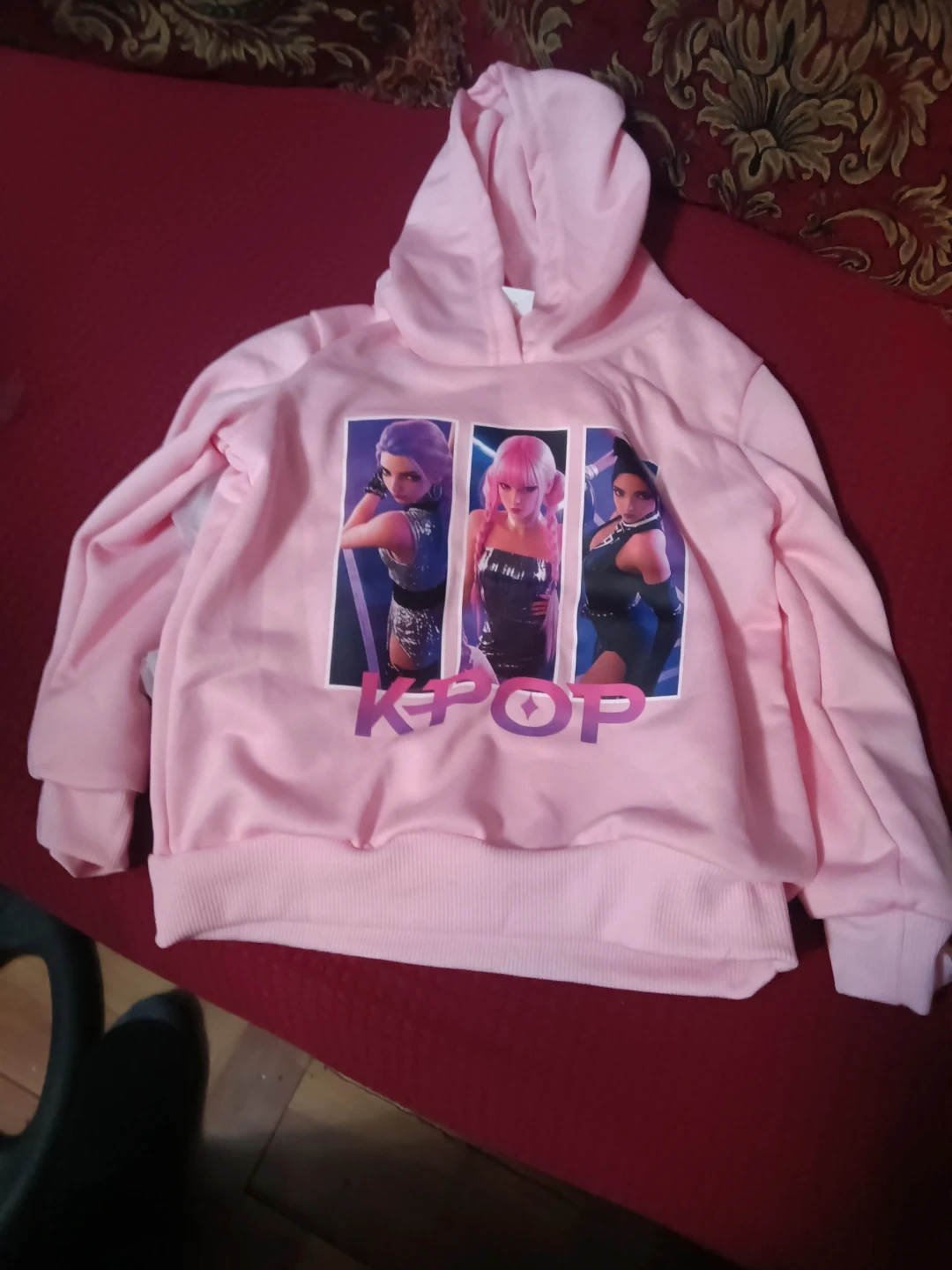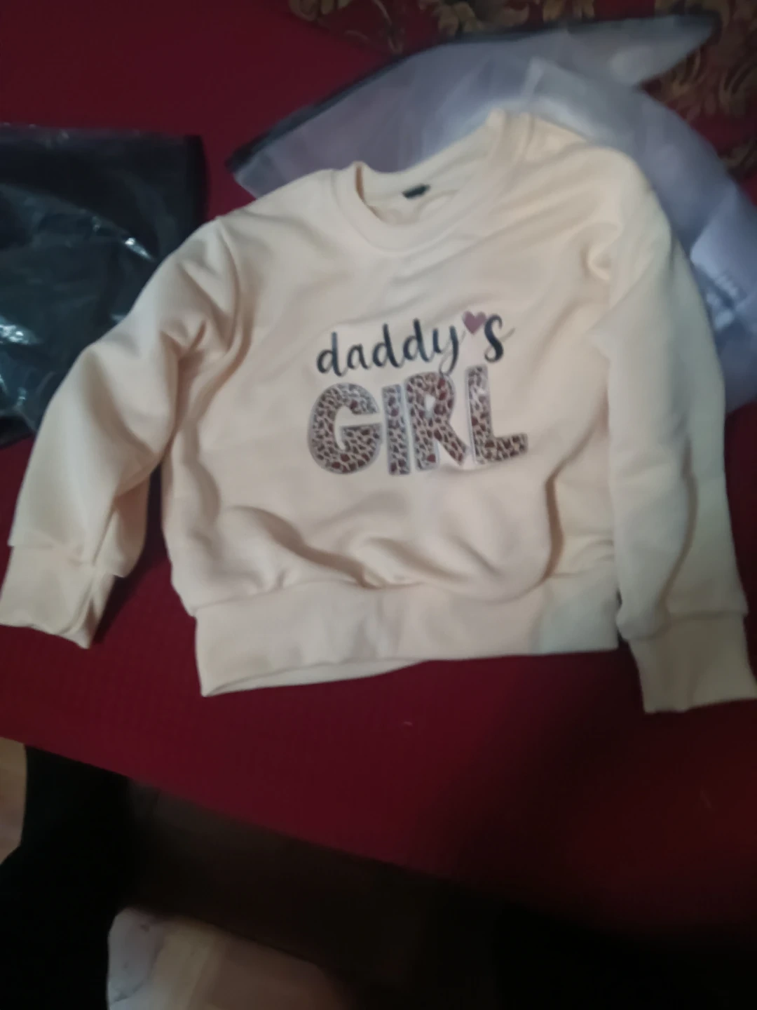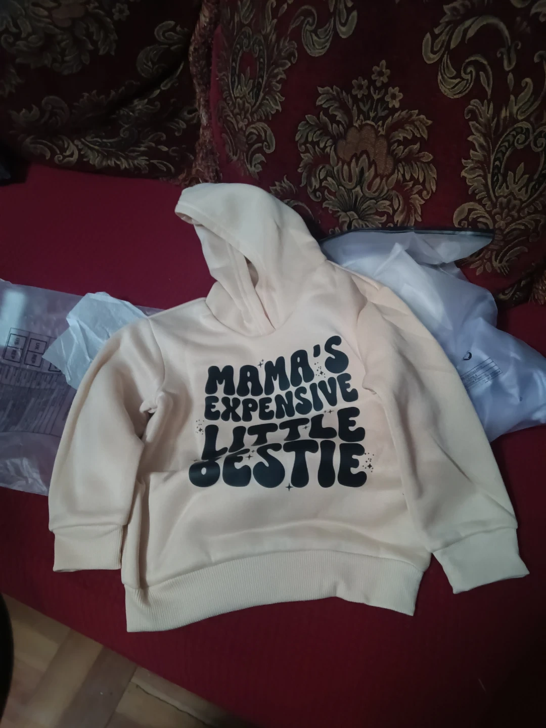 Selling a bundle of assorted children's clothing. Includes a black beanie with a 'V' design, a pink KPOP hoodie, a 'daddy's GIRL' sweatshirt, a heart-patterned pajama set, and a 'Mama's Expensive Little Bestie' hoodie sizes 4Y and 5Y