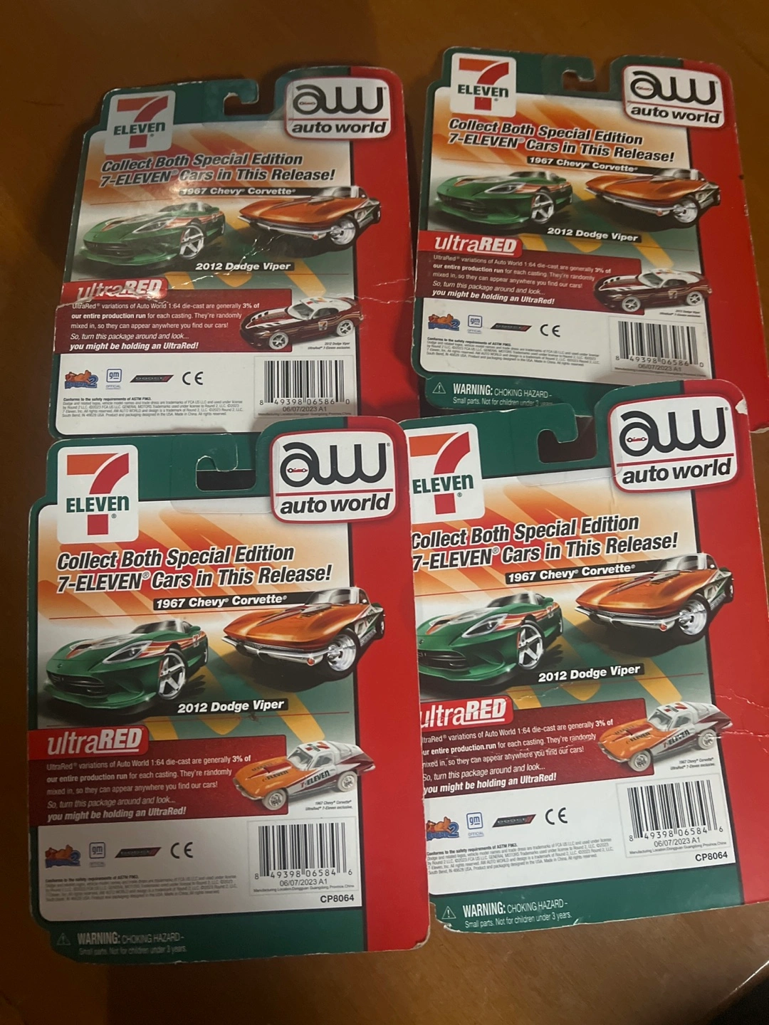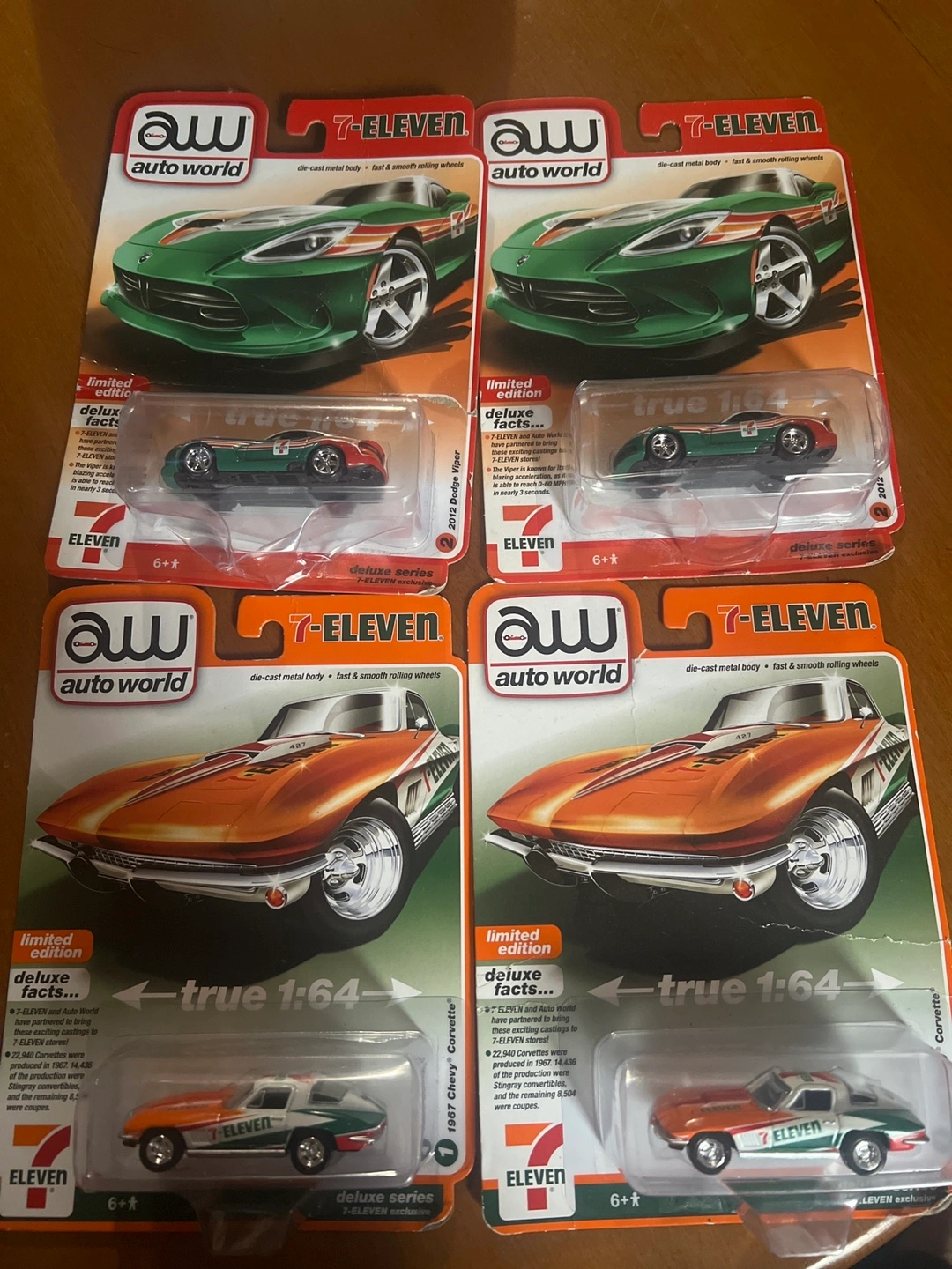 Last ones for sale***All 4 for 50, or each one $15. Selling a set of Auto World 7-Eleven die-cast cars. Each package includes a 1967 Chevy Corvette and a 2012 Dodge Viper. These cars are part of a special edition series. The cars are in true 1:64 scale and feature die-cast metal bodies with fast and smooth rolling wheels. They are new in package.