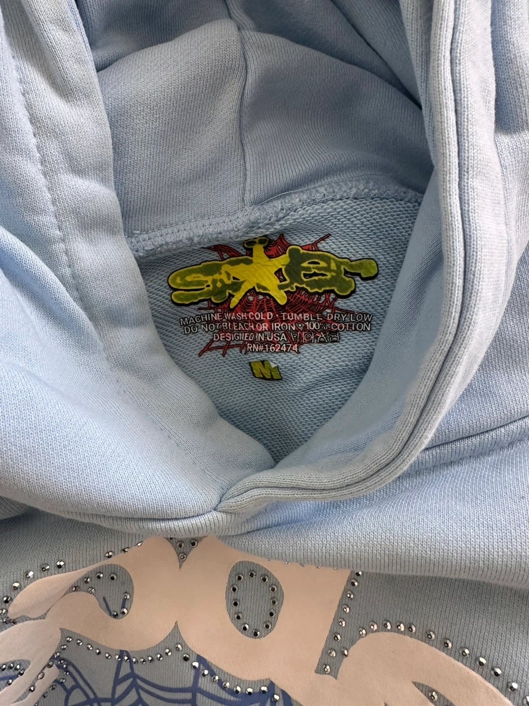 Selling a Sp5der hoodie in a lovely light blue! The size is M it's made of 100% cotton. It features a cool spiderweb design on the front. Machine wash cold and tumble dry low!
