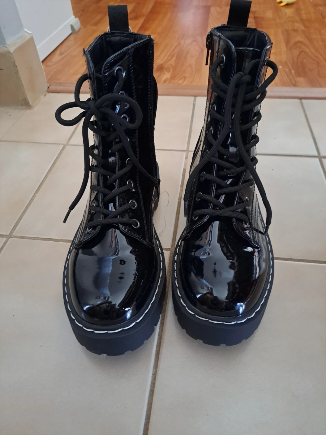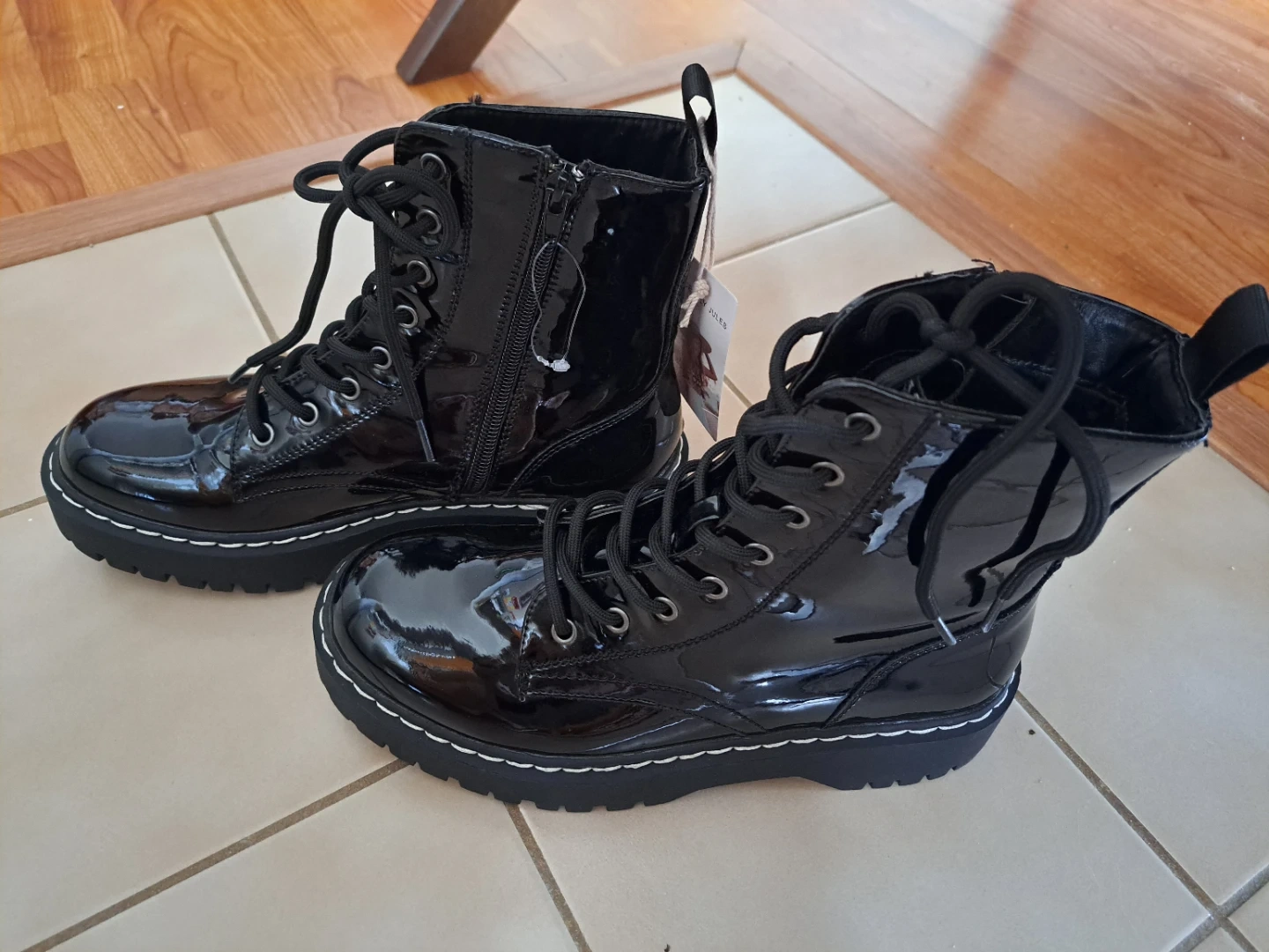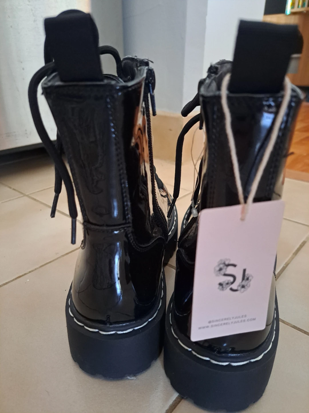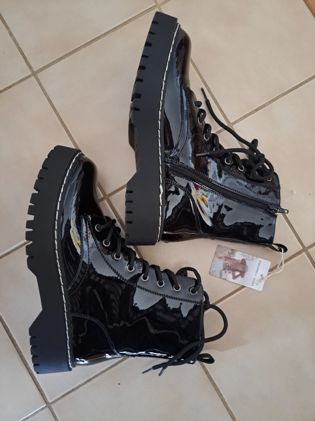 Here are some shiny black patent leather boots from Sincerely Jules! These are a size 8M and have a man-made upper and leather/man-made outsole. They're in brand new and ready for a new home!