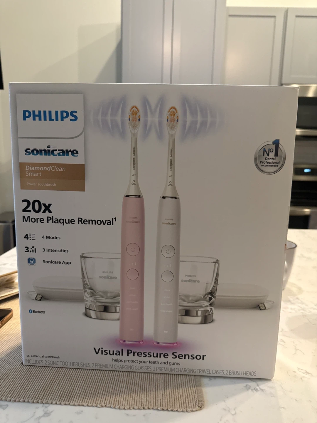 Selling 1 Philips Sonicare DiamondClean Smart Power Toothbrush. It includes 1 sonic toothbrushes, 1 premium charging glasses, 1 premium charging travel cases, and 1 brush heads. It features 4 modes and 3 intensities, and it connects to the Sonicare app via Bluetooth. This toothbrush offers 20x more plaque removal!