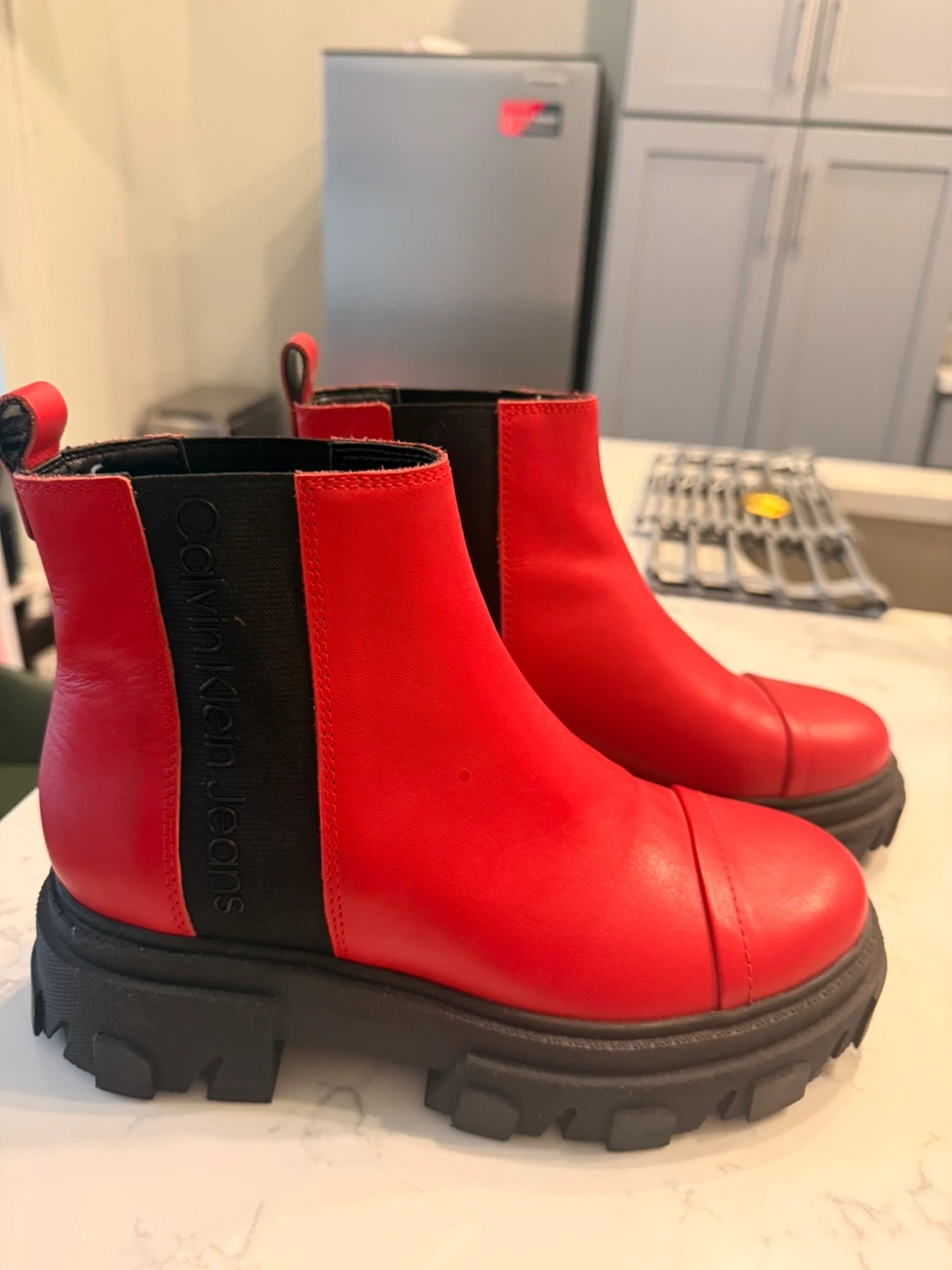 Selling a pair of Calvin Klein Leather Chelsea boots in a vibrant red color! These boots feature a chunky black sole and are in new condition. Size W7.