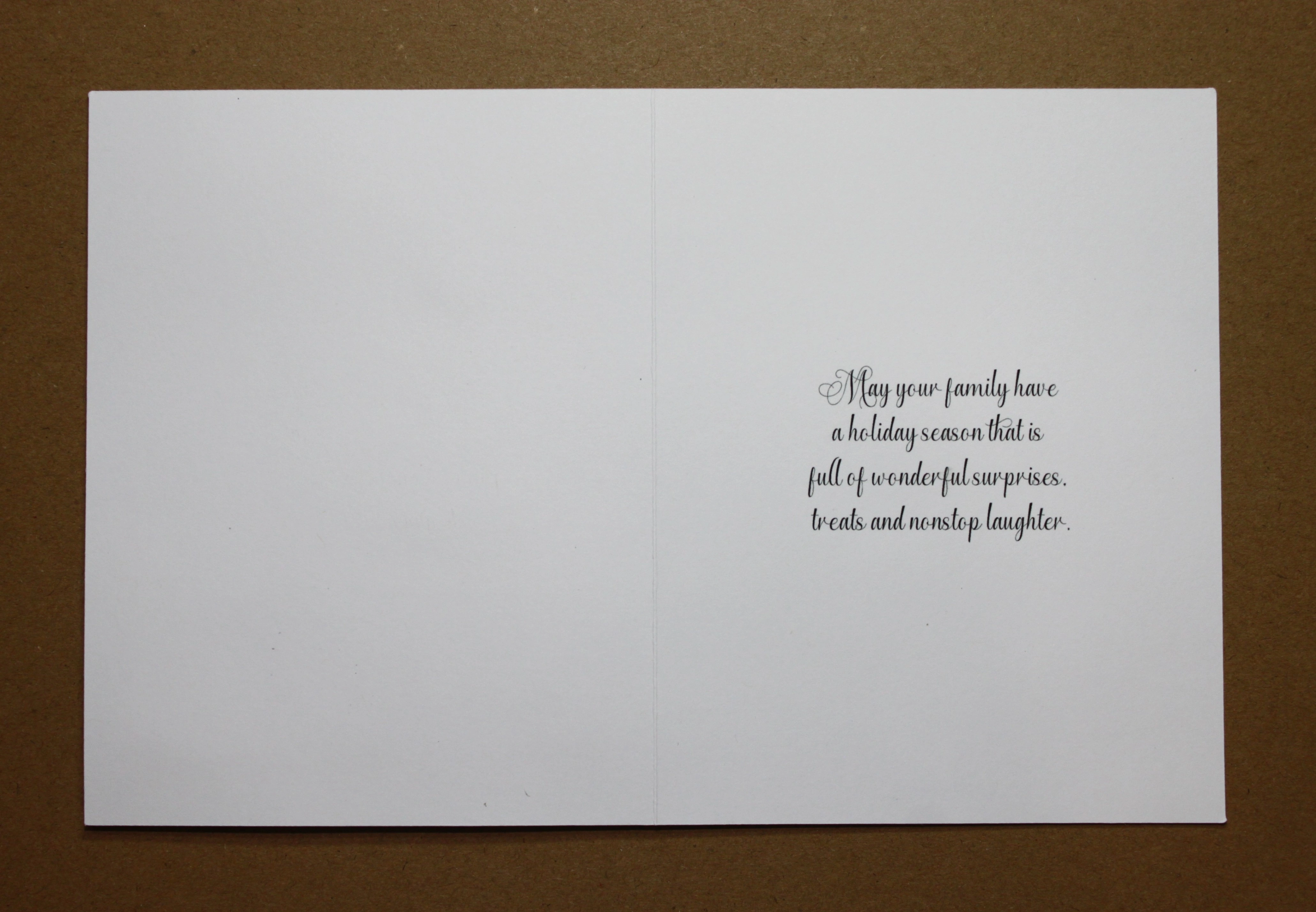 Card 2: Snowman with snowflakes - "May your family have a holiday season that is full of wonderful surprises, treats an nonstop laughter." - $4.50