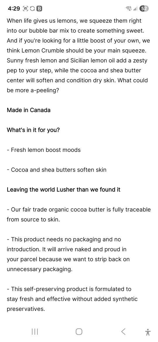 Looking to add a little zest to your bath time? This Lemon Crumble Bubbleroon from Lush is just the thing! It's a bubble bar that softens your skin with cocoa and shea butters, while the lemon and Sicilian lemon oil give you a refreshing boost. It's a self-preserving product, so it stays fresh without any added synthetic preservatives. Size is 200g, and it's made in Canada