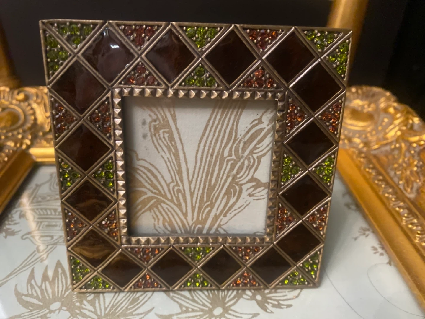 This is a small picture frame with a decorative diamond pattern around the edge. It features brown, green, and amber colored accents. It's perfect for displaying your favorite small photos! very heavy @casa_S_Decor
