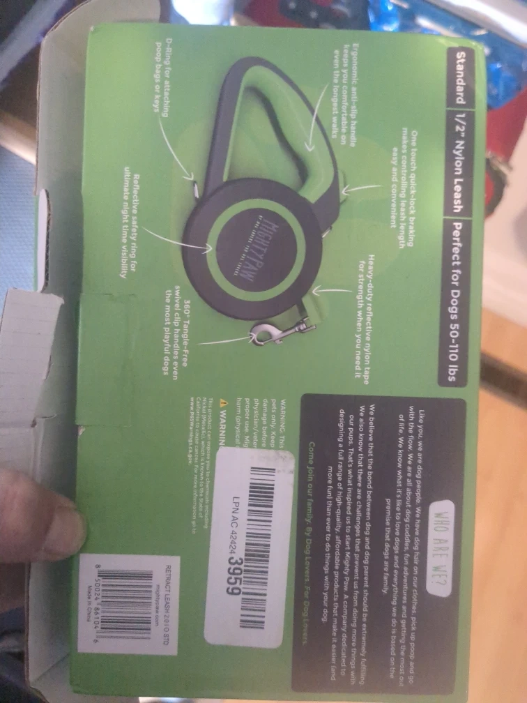 I'm selling a brand new Mighty Paw Retractable Dog Leash 2.0! It's standard size, 16 feet, and perfect for dogs up to 110 lbs. The leash features a reflective design for safe and visible night walking. The box is included!