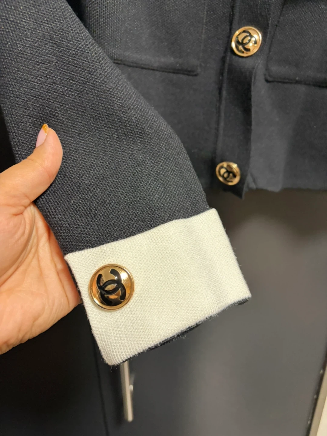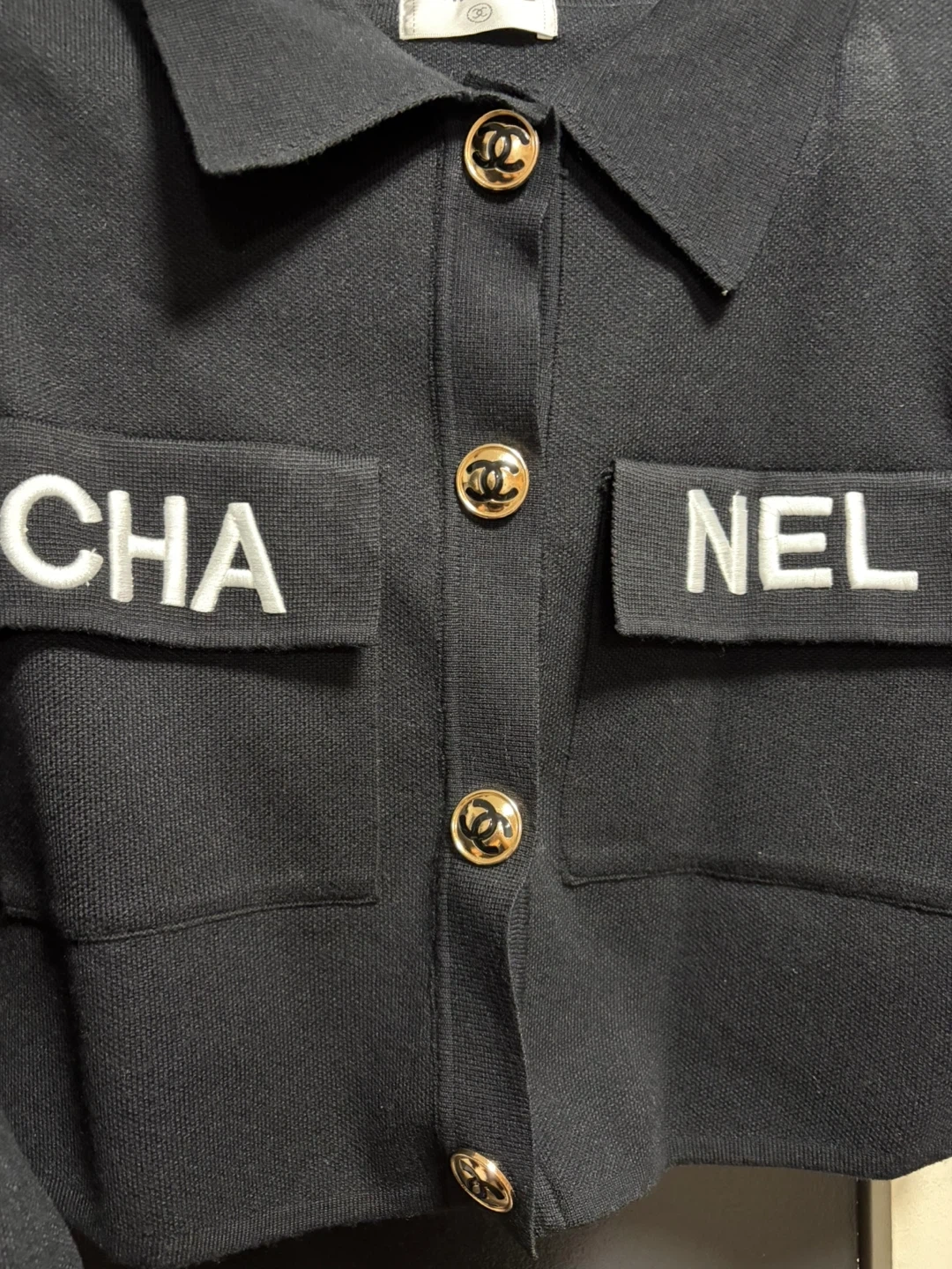 Here's a chic Chanel black knit cardigan! It features the Chanel logo on the buttons and 'CHA NEL' embroidered on the pockets. The cuffs are white, adding a nice contrast to the black knit material. Feel free to reach out if you have any questions!