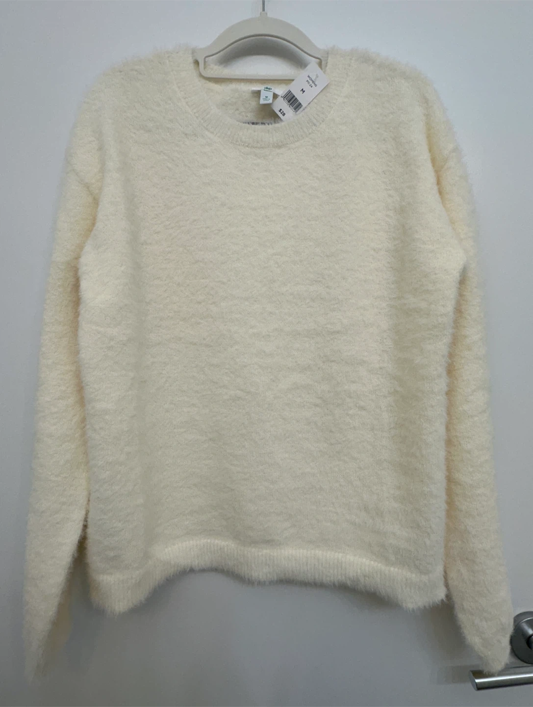 Cozy up in this cream-colored fuzzy sweater from Almost Famous! It's a size medium and feels super soft to the touch. Perfect for adding a touch of warmth and style to your wardrobe