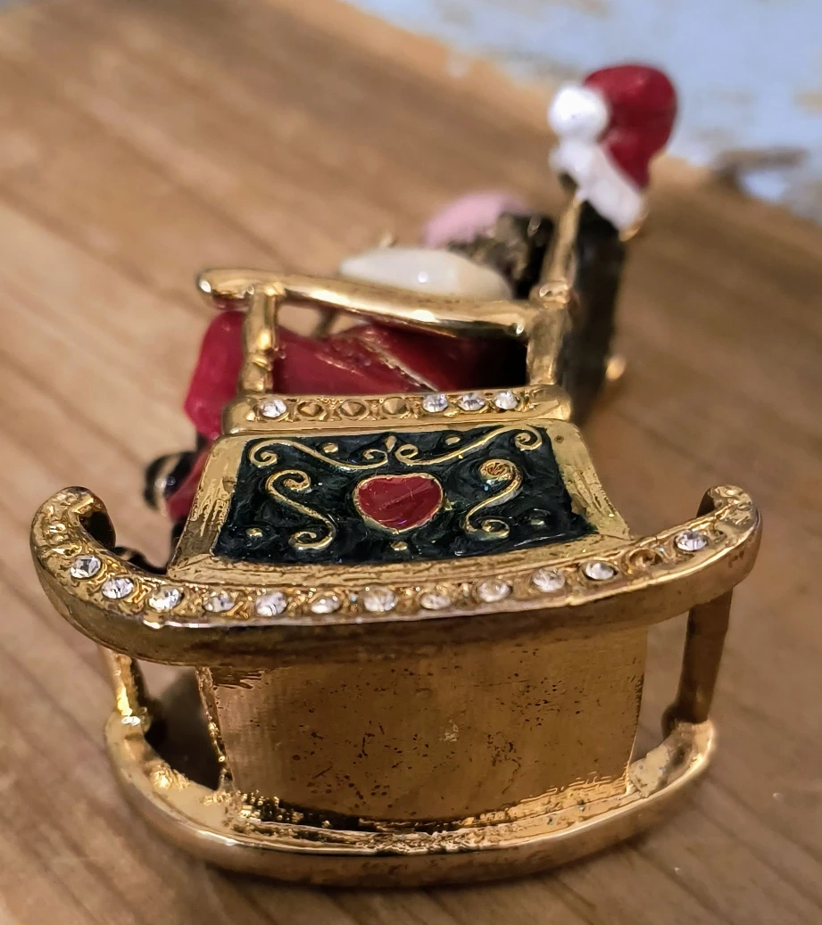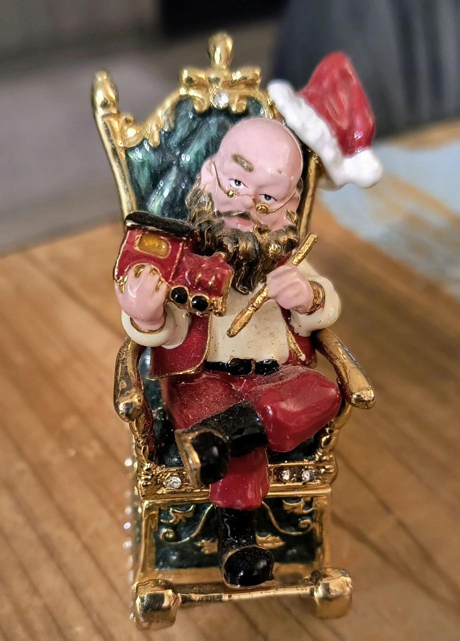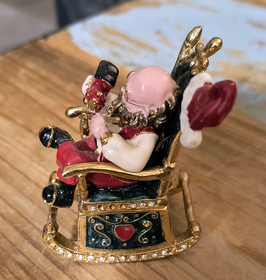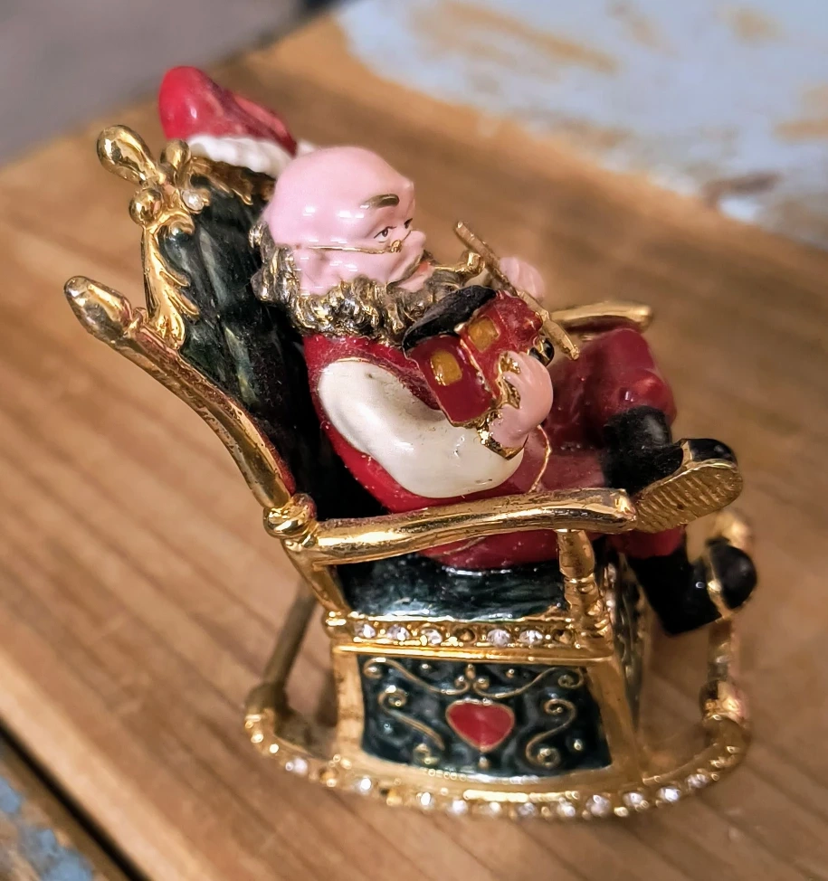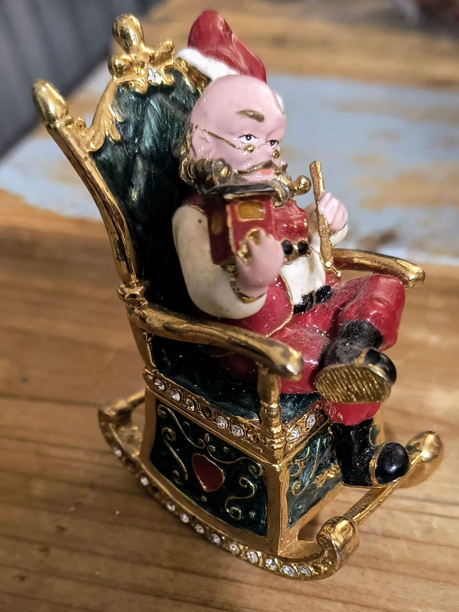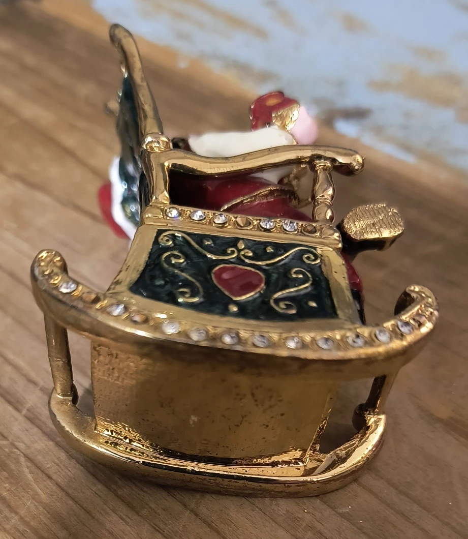 Here's a charming hinged trinket jewellery box featuring Santa Claus relaxing in a rocking chair! It's adorned with gold accents and sparkling rhinestones, making it a festive and elegant addition to any collection or decor.