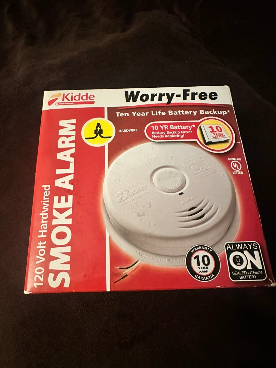 Selling a Kidde Worry-Free smoke alarm. It's a 120 Volt hardwired model with a ten-year life battery backup. The battery never needs replacing, so you can have peace of mind! It also has a 10-year warranty.