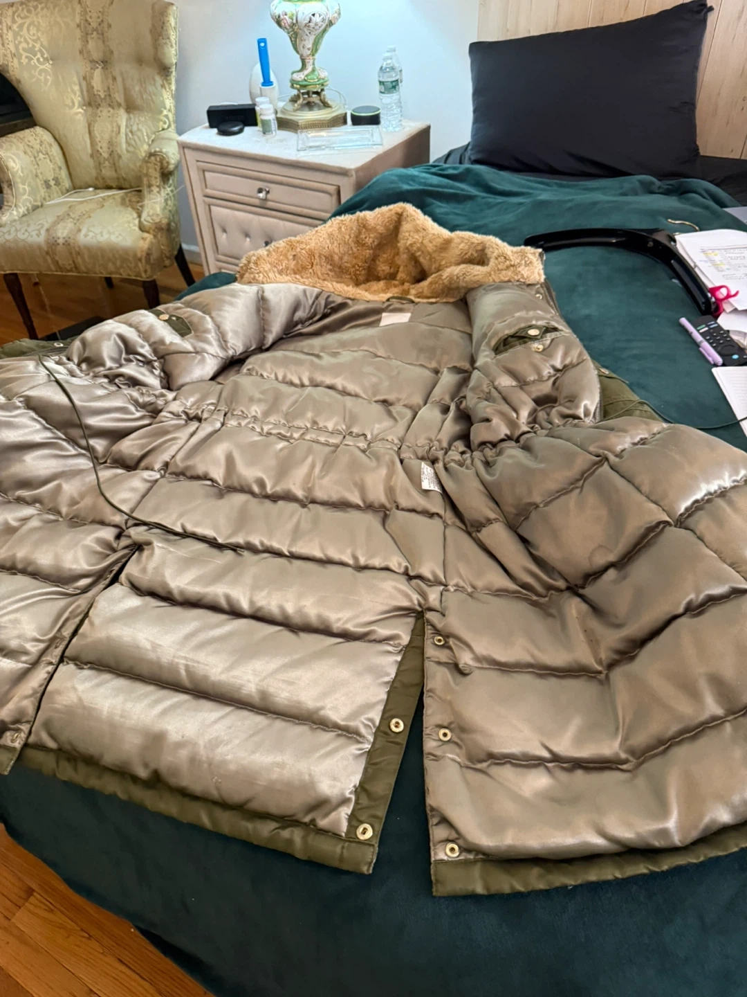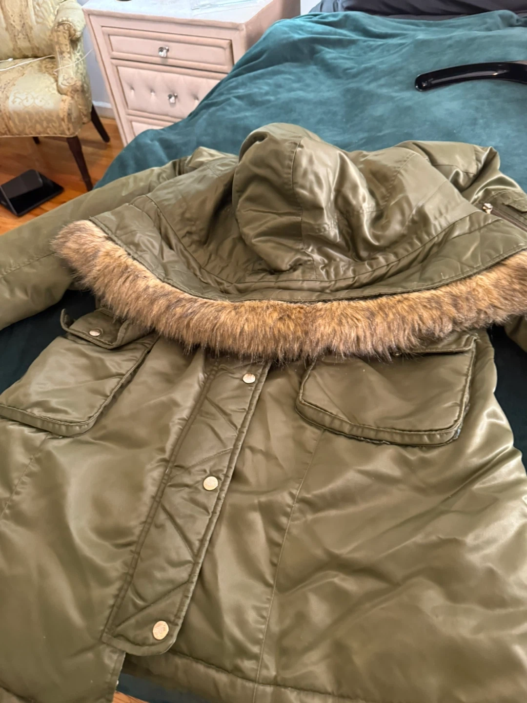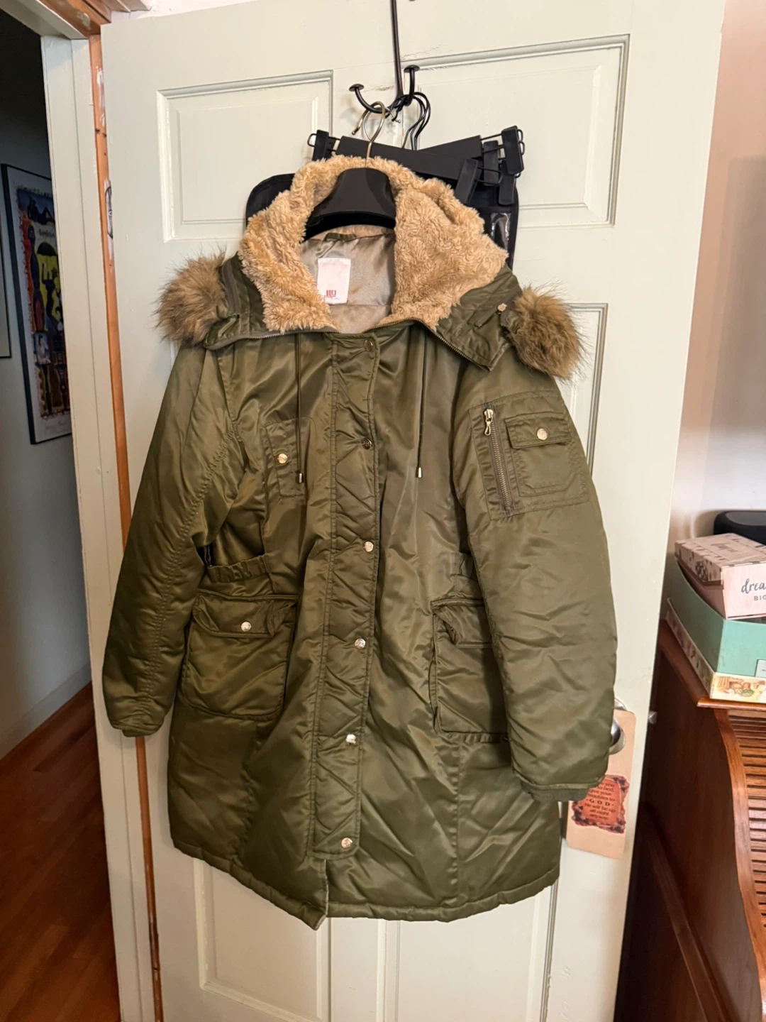 Jlo coat. Here's a comfy olive green padded parka coat! It has a faux fur hood and lots of pockets. Perfect for staying warm and stylish during the colder months