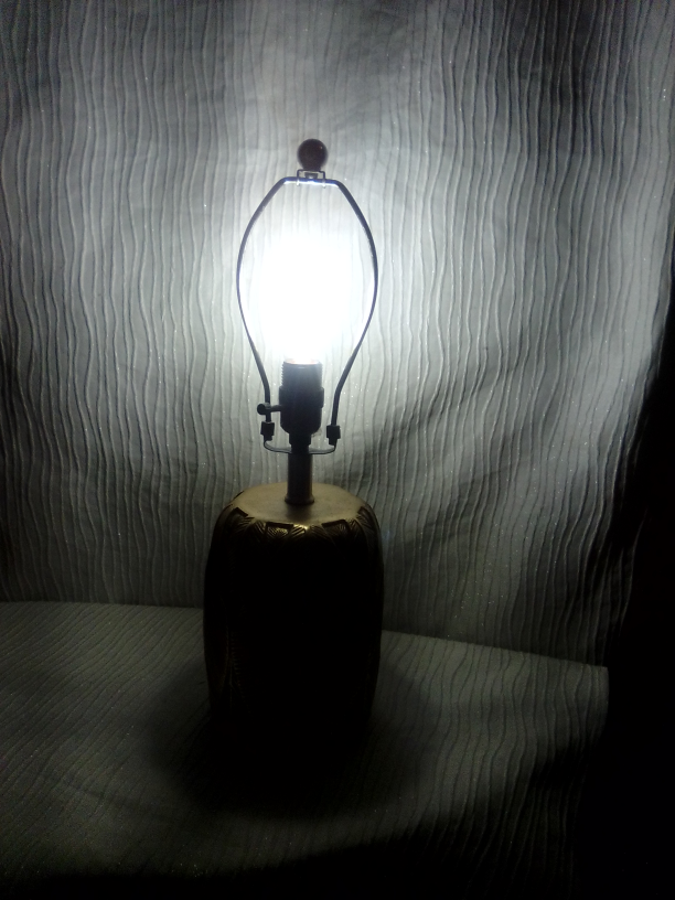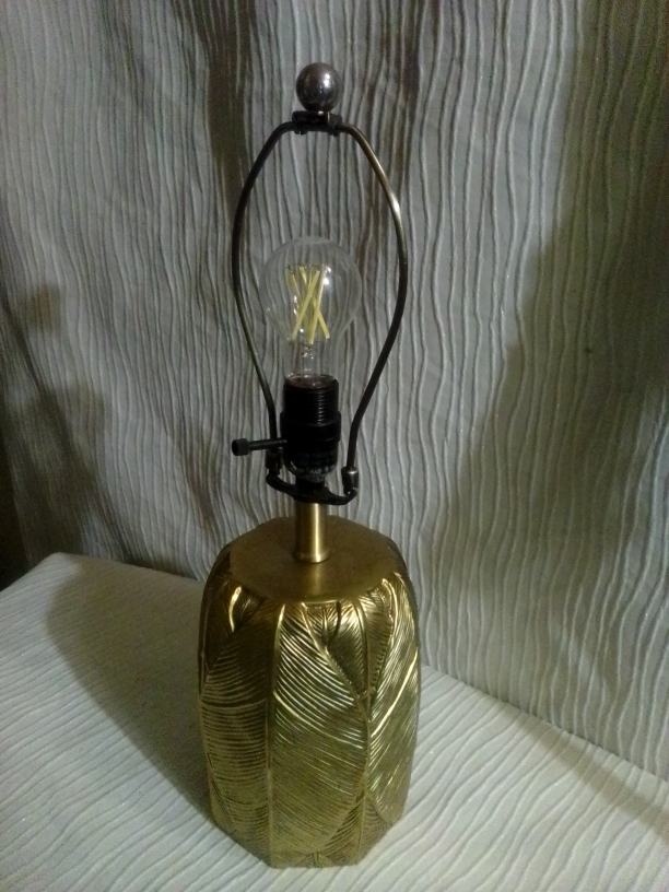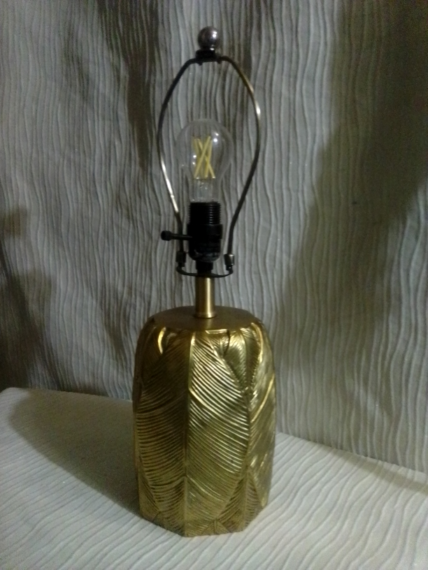 Selling a table lamp with a unique gold leaf pattern. It adds a touch of elegance to any room. The lamp is in great condition and provides a warm, inviting light. Perfect for a bedside table or living room accent!