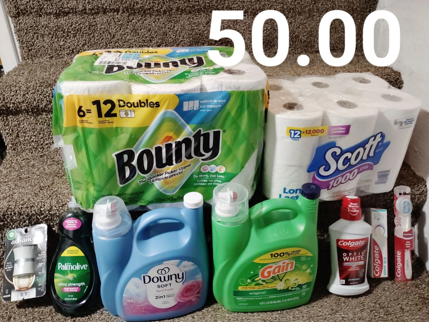 Household essentials bundle including Bounty paper towels (6=12 doubles), Scott paper towels (12=1000 sheets), Downy Soft April Fresh fabric softener (190 loads), Gain Original laundry detergent (4.25L), Palmolive Ultra Strength dish soap, Colgate Optic White mouthwash, and Colgate toothpaste. Also includes Air Wick Scented Oil refill and two toothbrushes.