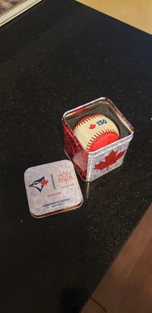 Selling a commemorative baseball in a tin, celebrating Canada's 150th anniversary with the Toronto Blue Jays and Rogers! It's a limited edition item, perfect for any baseball fan or collector