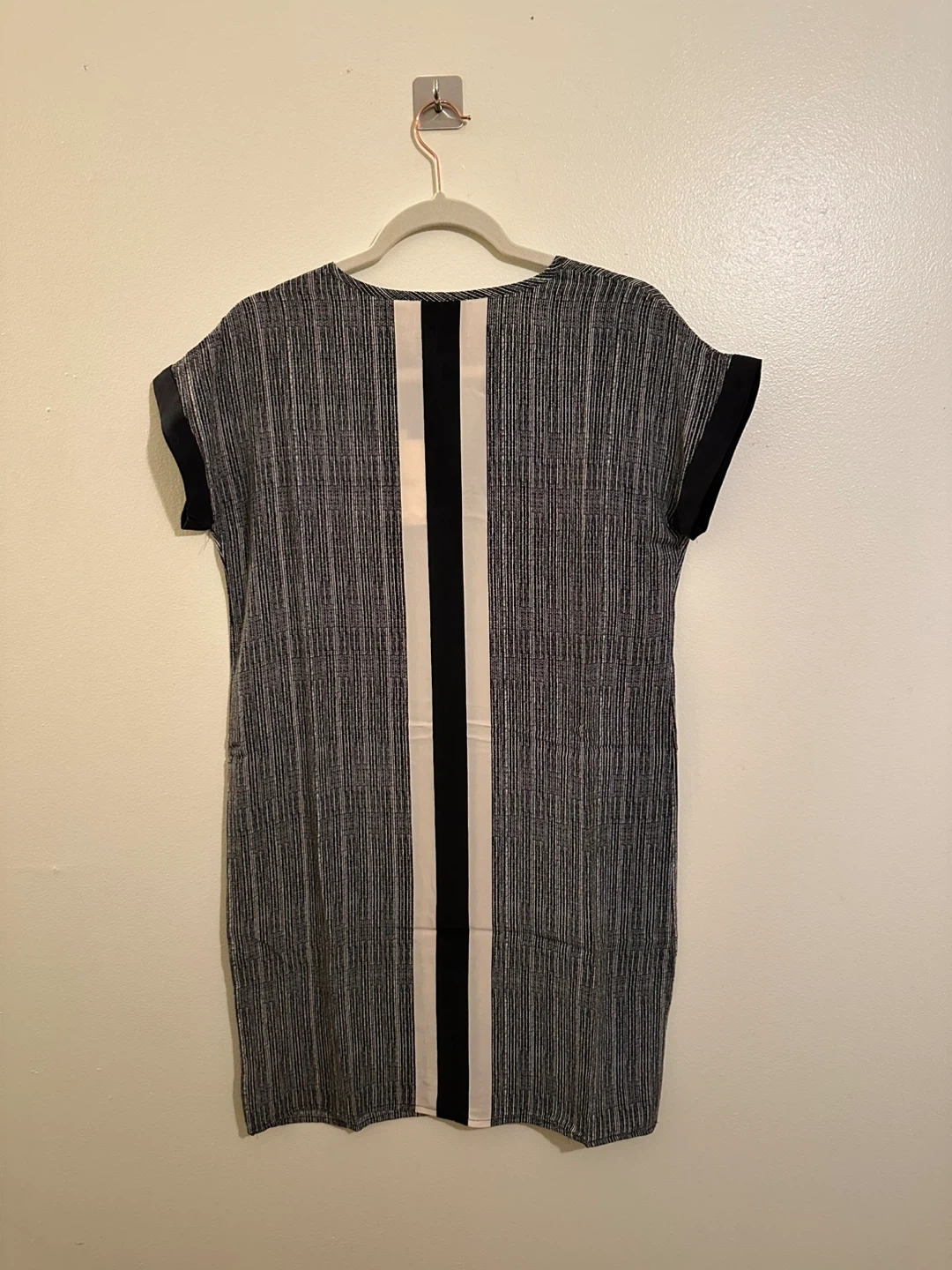 Cynthia Rowley Silk Shift Dress Gray Black Size 2. Features casual knee length dress, 100% silk, beautiful design of greys and black, short sleeve, flowy fun comfortable fit.