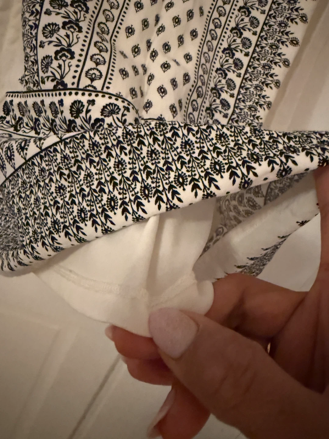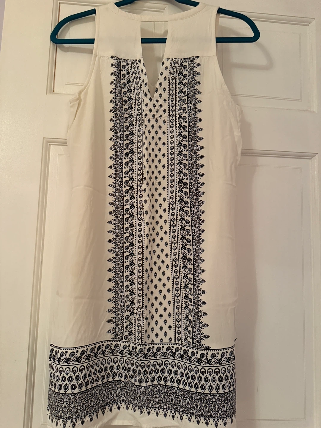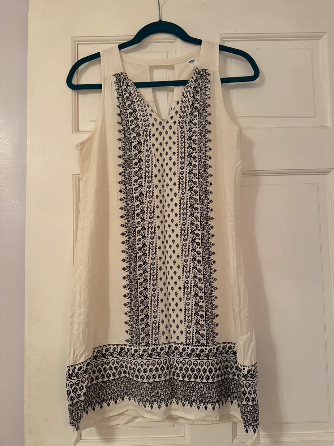 Selling a cute Old Navy dress in size small. It's a sleeveless, cream-colored dress with black and white patterned detailing. Perfect for a casual day out!