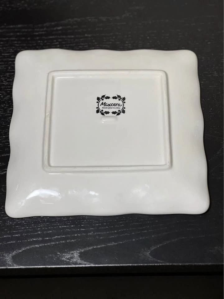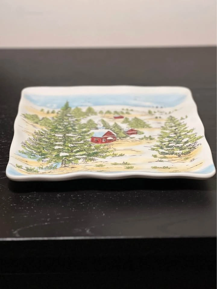 This is a Maxcera Snowville square plate, featuring a winter scene with a snowy forest and a red cabin. It's part of the "Snowville" collection by Maxcera Corp, a discontinued line of ceramic dinnerware. Crafted in China, it's an 8 3/4-inch salad plate. The design includes a white plate with green pine trees, a red cabin house, and a blue sky. As a discontinued item, it's considered a rare find. Preowned. Pickup is 58th and 7th Ave in midtown Manhattan