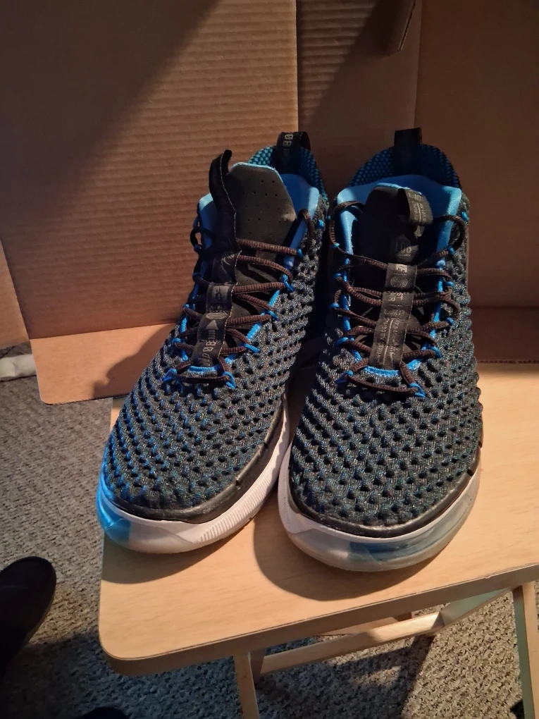 Selling a pair of Nike Zoom LeBron III basketball shoes. They feature a stylish black and blue colorway. These shoes are great for playing basketball or just wearing around town