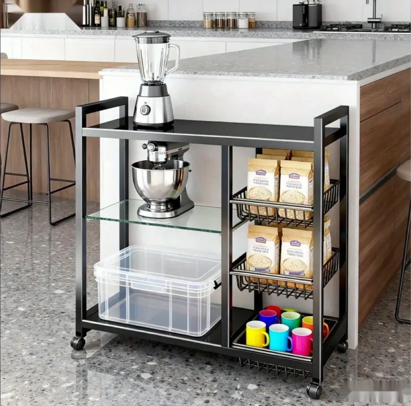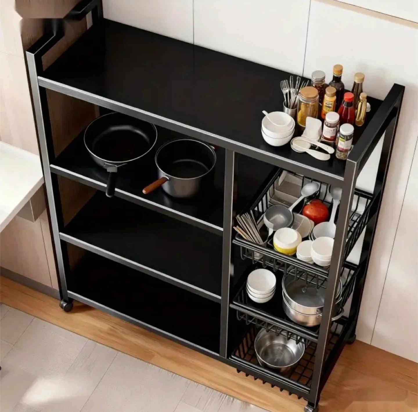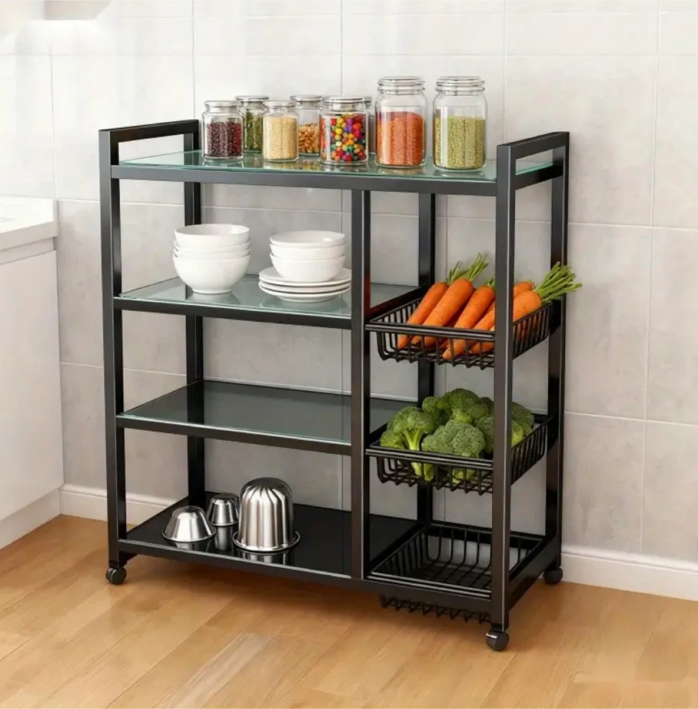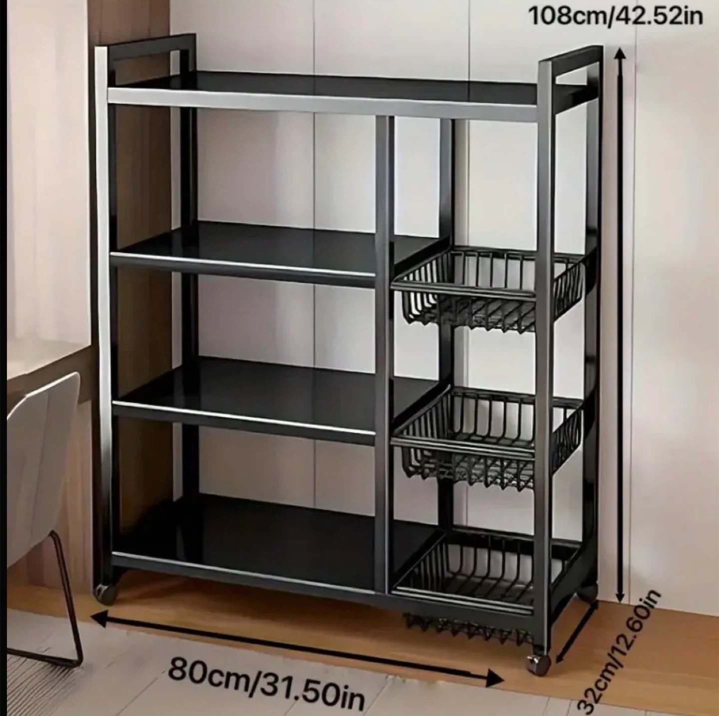 This is a black kitchen storage rack with wheels. It has multiple shelves for storage and organization. The dimensions are approximately 108cm (42.52in) in height, 80cm (31.50in) in width, and 32cm (12.60in) in depth. It's perfect for keeping your kitchen tidy and organized!