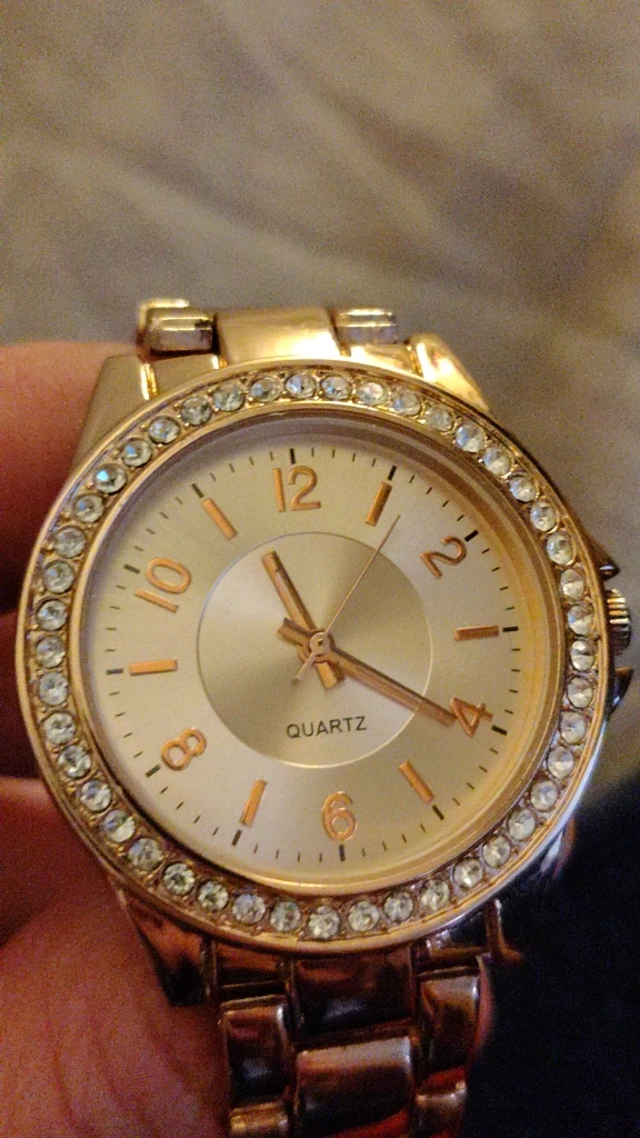 Selling a stylish rose gold quartz watch. It features a stainless steel back and a crystal-accented bezel. The watch has a classic design and is in excellent condition!