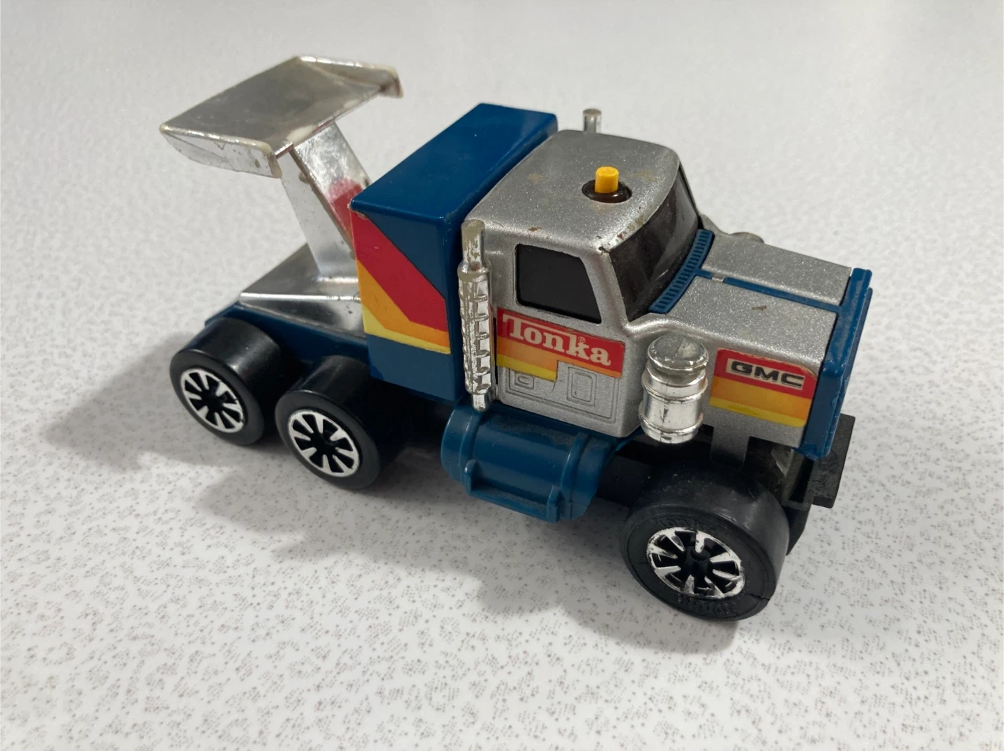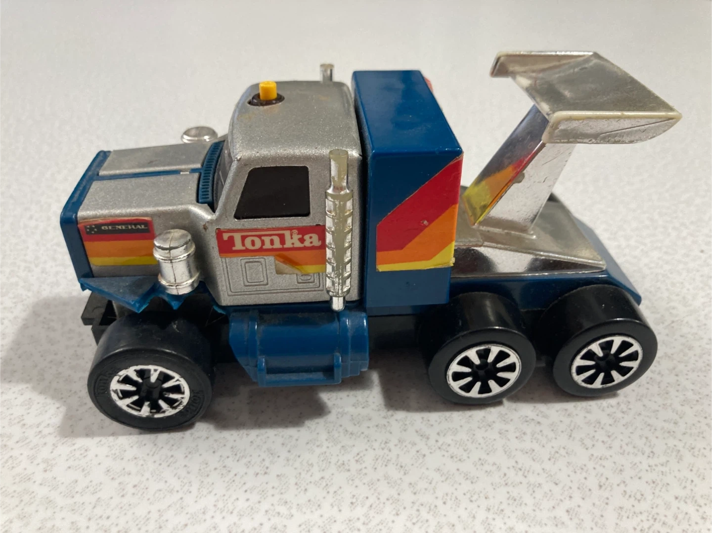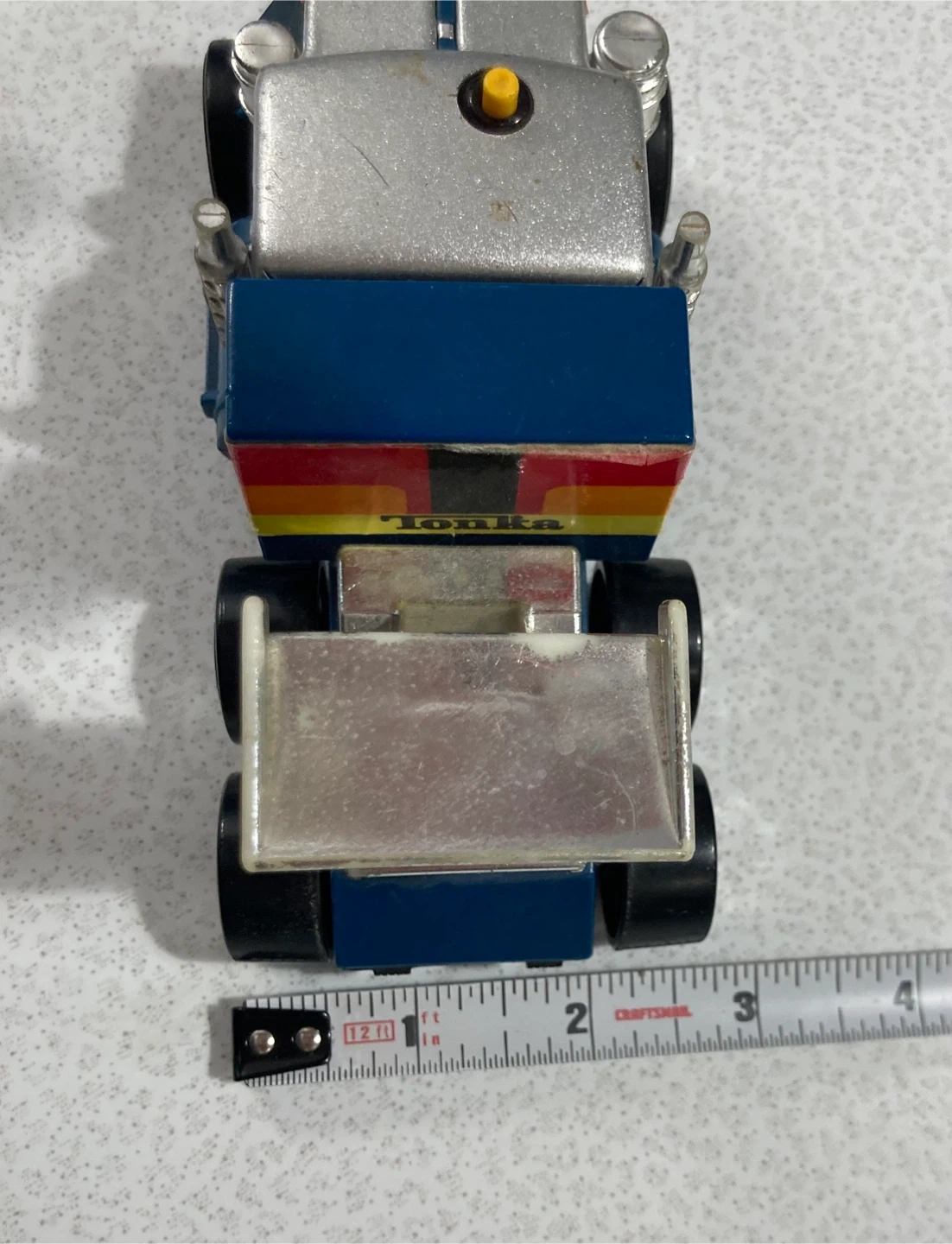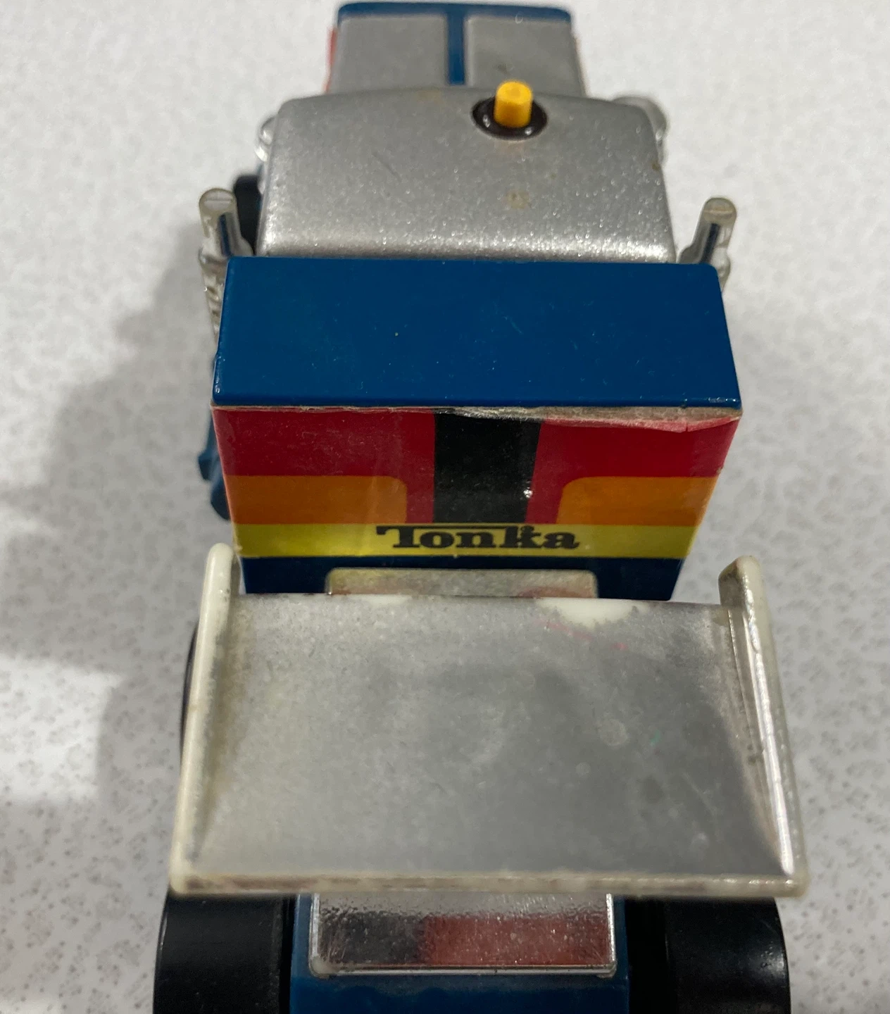 Selling a vintage Tonka GMC General toy truck! It's a classic piece with the iconic Tonka design. The truck has a silver and blue color scheme with rainbow detailing. It shows some signs of wear, which adds to its vintage charm!
