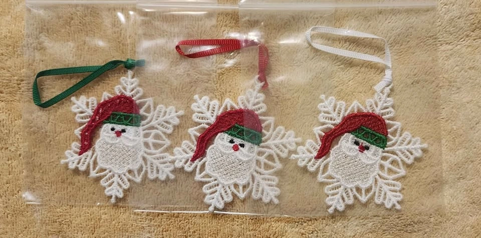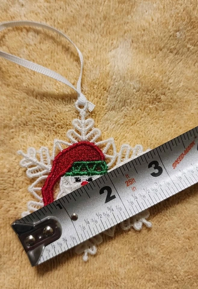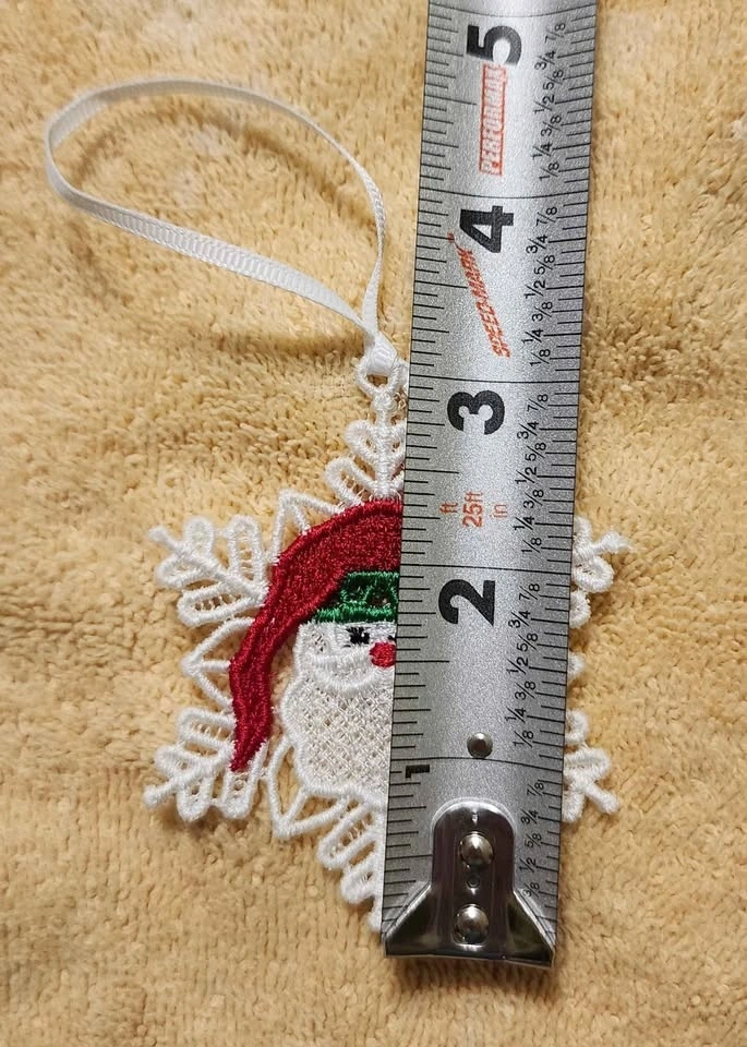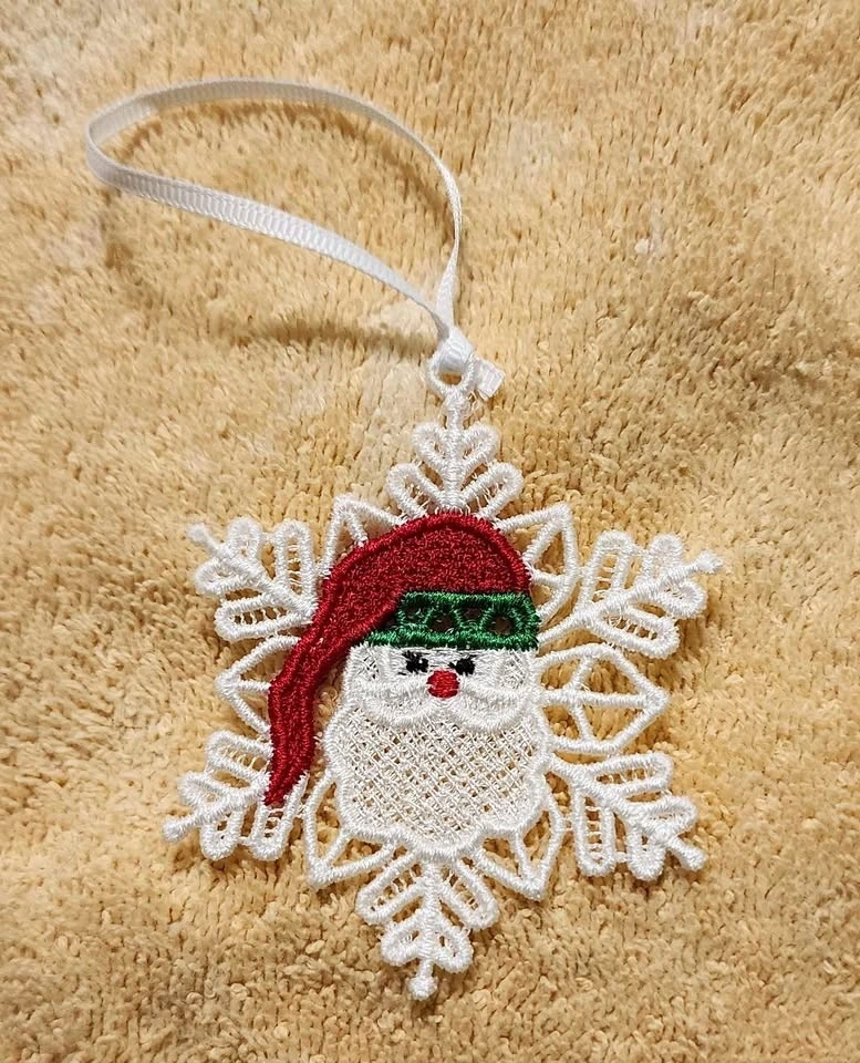 Machine embroidered Christmas lace ornament.