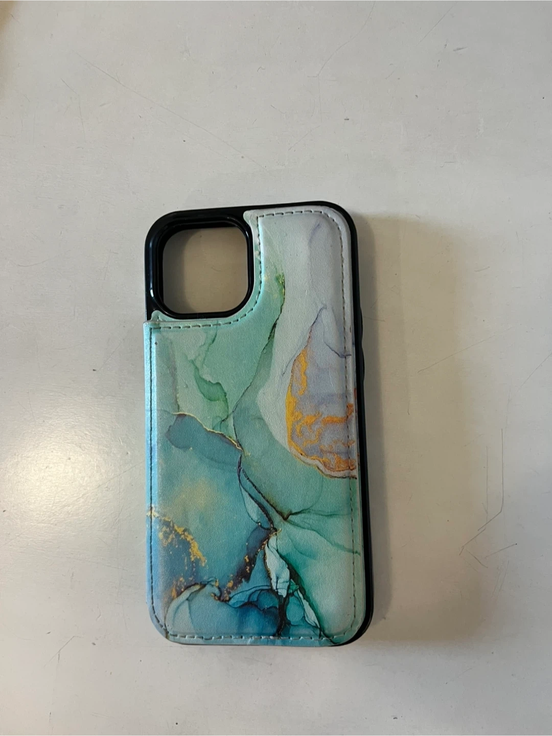 This is a uCOLOR wallet case for the iPhone 13 mini. It features a mint purple marble design. It has card slots and a double magnetic clasp. The case also has RFID blocking technology to keep your personal information safe. It's shock resistant and provides an effective cushion for your device