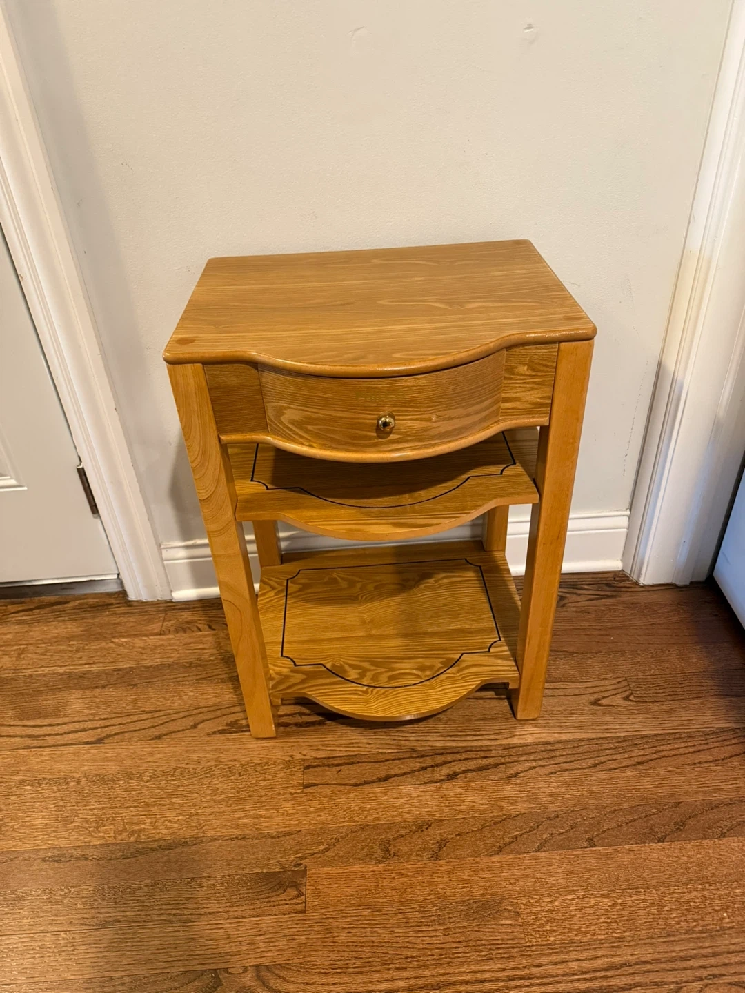 Selling a cute Philco wooden nightstand! It features a drawer and two shelves, perfect for bedside storage or as a small accent table in any room. It's in good condition and ready to add a touch of charm to your home