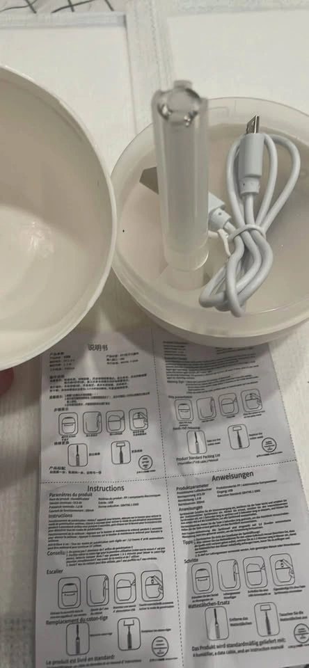 I have a brand new humidifier that I believe was made to be next to your bed, like on a nightstand. I ended up getting a larger one and never ended up using this one. It is plugged in with a USB and the brand new cord is included.