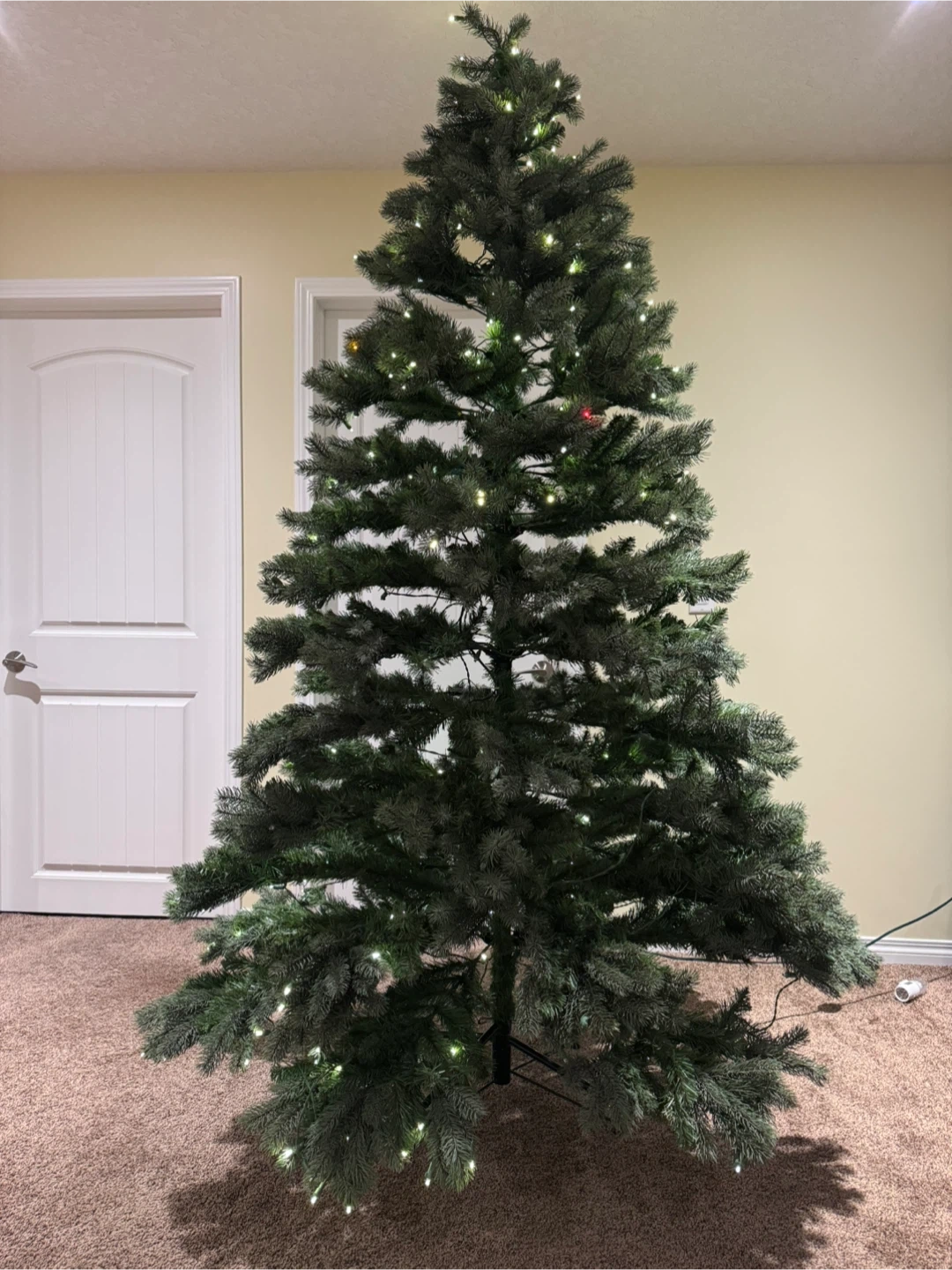 The tree itself is in great condition. It is pre-lit with clear LEDs, but some of them are not working. Can be decorated with your own favorite lights.