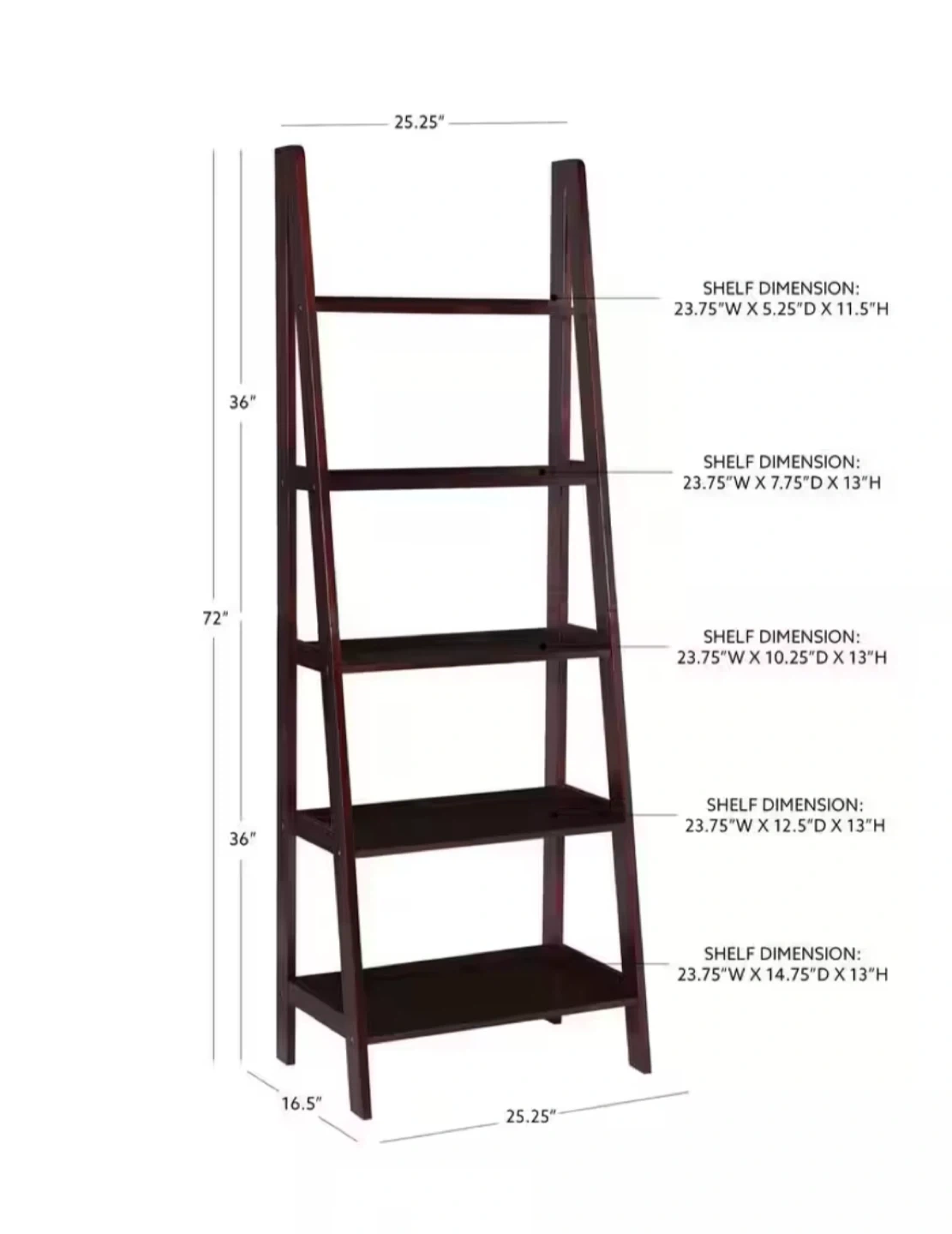 - Shelf dimensions vary from 23.75"W x 5.25"D x 11.5"H to 23.75"W x 14.75"D x 13"H