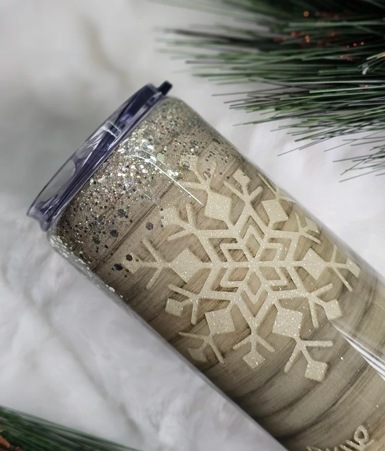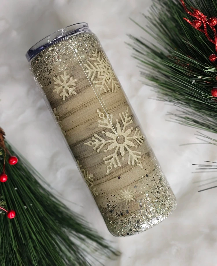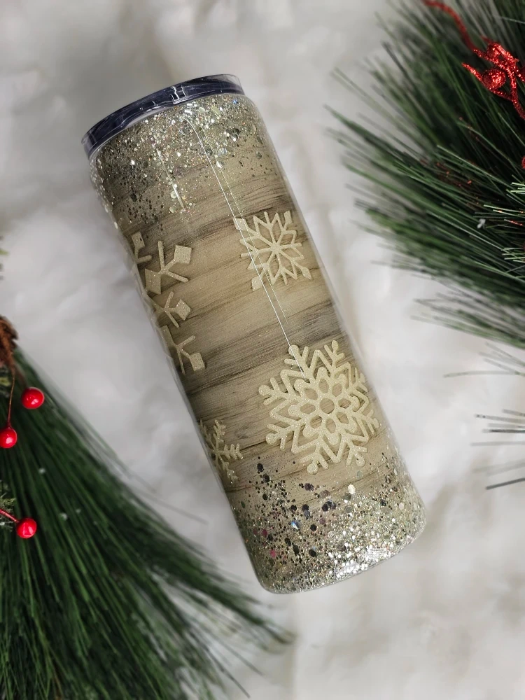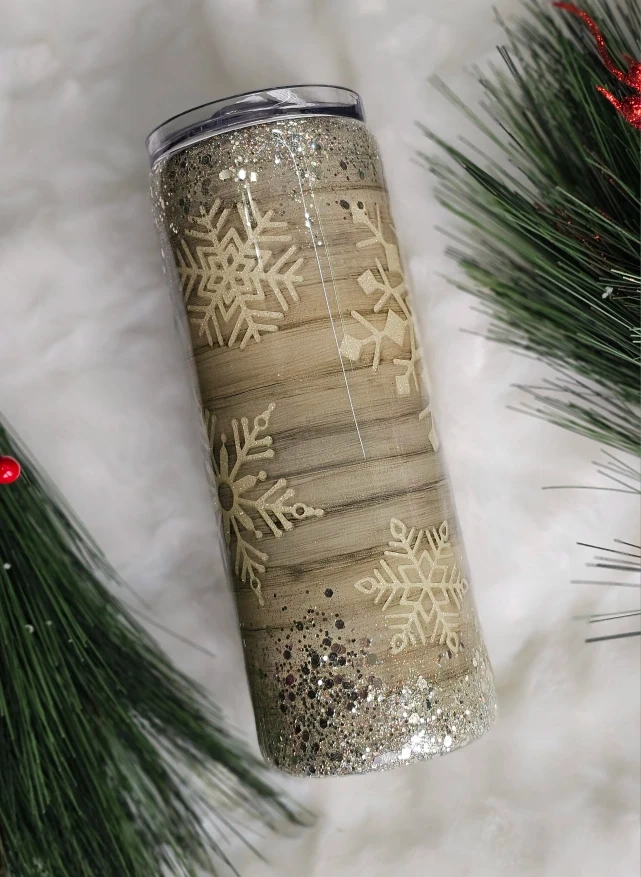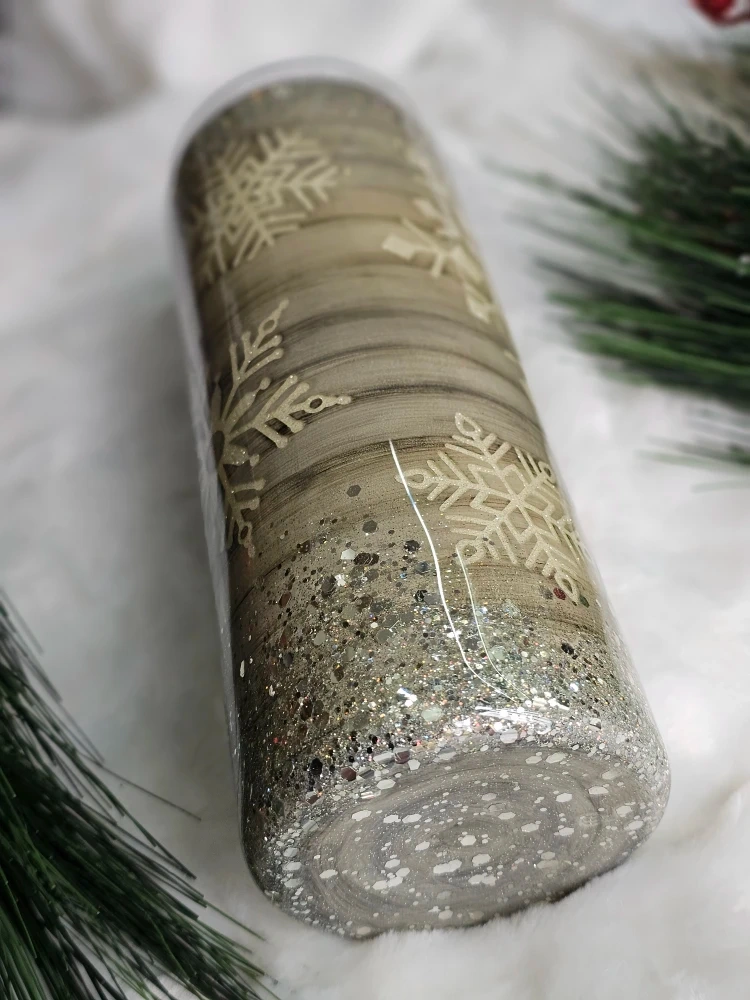 Get ready for the holidays with this beautiful snowflake 20 oz epoxy tumbler! It's got a lovely Handpainted wood-look with Peekaboo shimmering glitter snowflake and chunky silver glitter. Perfect for keeping your drinks cold or hot in style this holiday season. Hot chocolate to go.