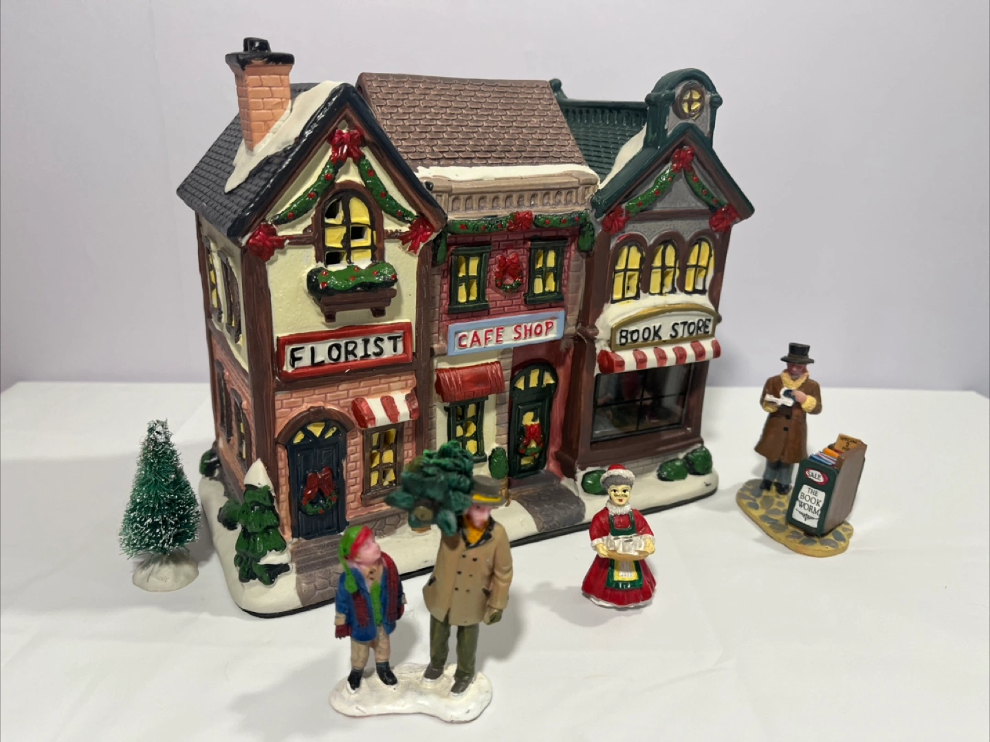 Selling a charming Vintage Victoria Village Christmas display. It features a florist, café shop, and bookstore, complete with figurines and miniature Christmas trees. This set would be perfect for adding a touch of festive cheer to your holiday decorations!